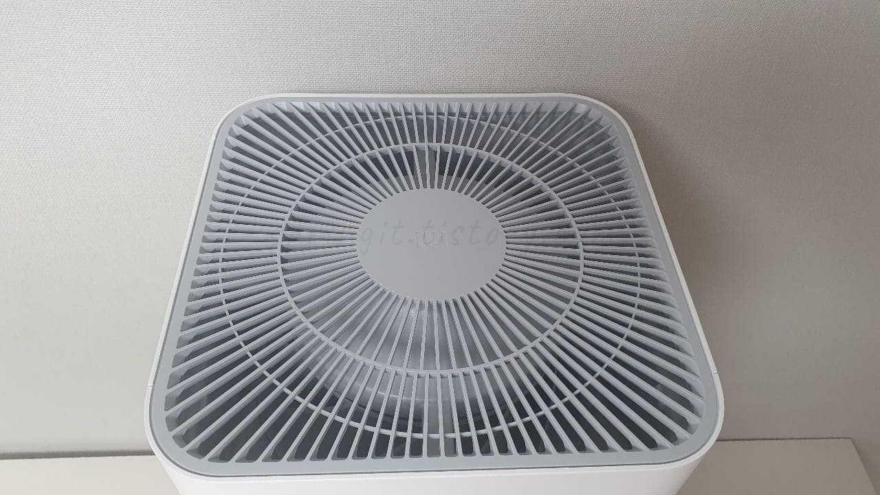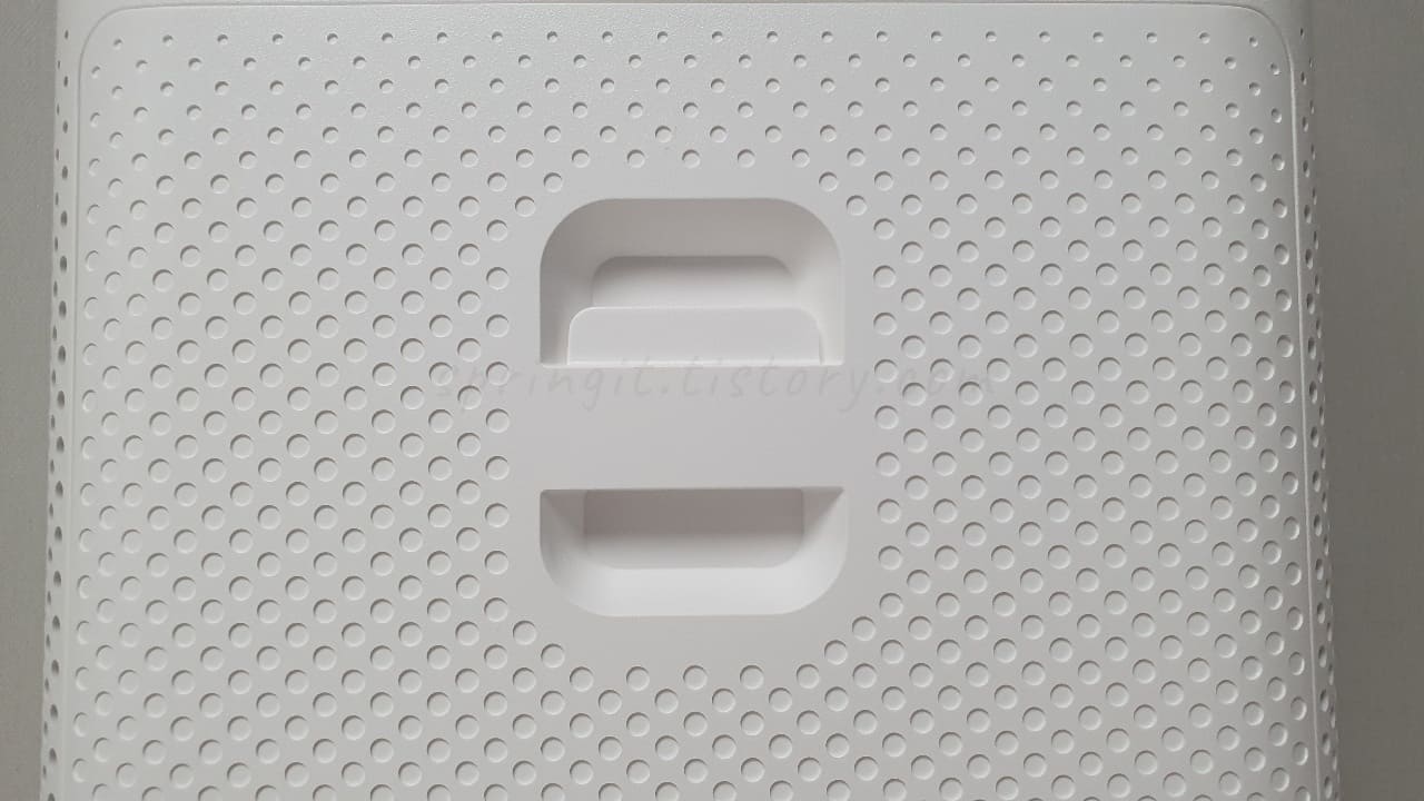 샤오미 미에어 3H 상단부입니다. 하단 구멍들에서 빨아드린 공기가 필터를 거쳐 깨끗해진 후 이곳에서 배출되게 됩니다. 제가 사용해본 결과 선풍기 약풍~중풍정도로 바람세기가 나오더군요.