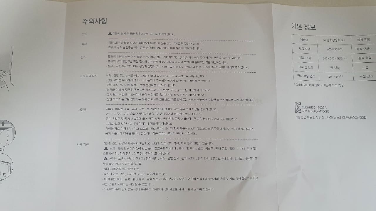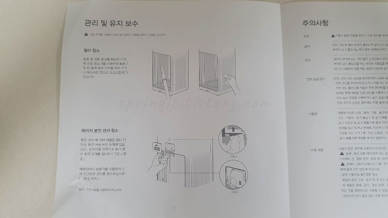 설명서에서는 청소방법과 주의사항, 앱 연결 방법, 와이파이 재연결 방법 등 보다 상세한 정보들이 나와있습니다. 참고하셔서 공기청정기를 사용하시면 좋을 것 같네요.