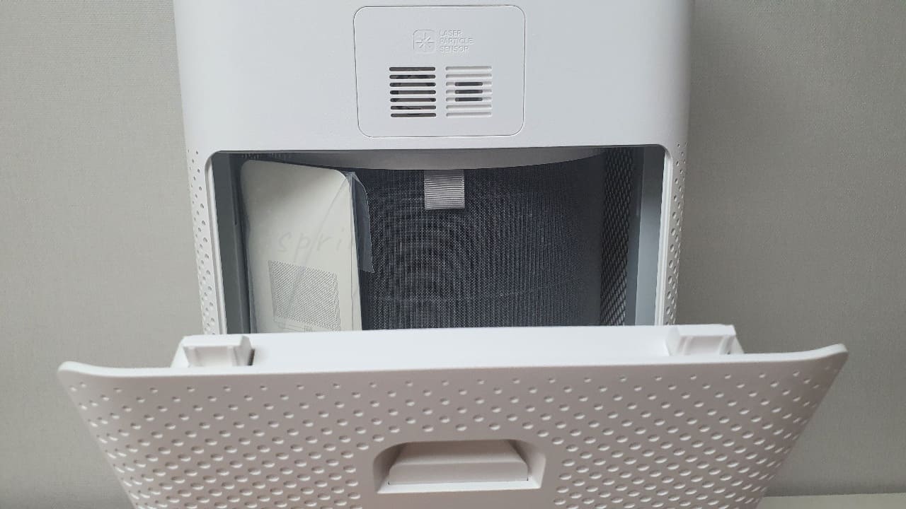 샤오미 미에어 3H 후면부입니다. 이곳에서 상단에 물리식버튼이 있는데 이것을 누르면 디스플레이의 밝기가 아주밝음/밝음/꺼짐 순으로 변경됩니다. 밤에 잘 때는 낮은 밝기로 바꿔주는 것이 좋겠죠. 그리고 중앙쪽에는 미에어 3H 센서가 달려있습니다. 레이저 방식으로 공기의 미세먼지를 감지해주게 됩니다. 그리고 아랫쪽에는 필터를 교체하는 커버가 달려있습니다.