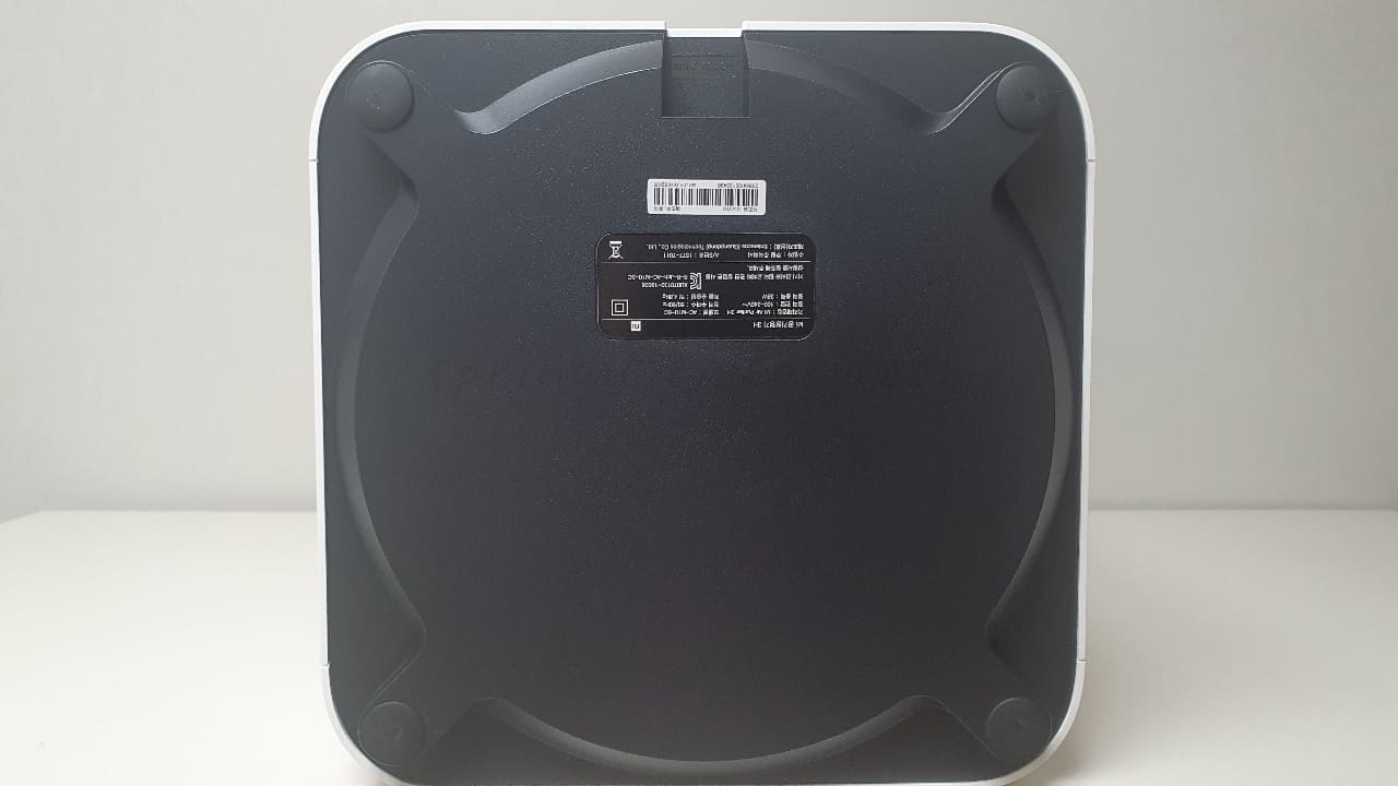 샤오미 미에어 3H 하단부입니다. 고무마게가 4방향에 있고 중앙에는 제품의 바코드, 사양라벨이 적혀져있습니다. 또한 상단쪽을 보시면 케이블을 연결하는 전선코를 확인할 수 있습니다.