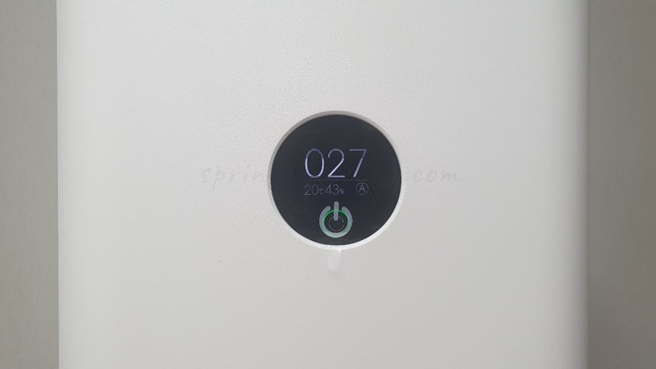 디스플레이에서 보여지는 현재 27은 지금 공기오염수치이고 높을수록 오염도가 높음을 의미합니다. 오염도가 높을수록 초록색에서 주황색, 빨강색으로 진해지게 되며 모터가 더 빠르게 돌아갑니다. 아래에는 온도, 습도가 보여지고 현재 사용중인 기능이 보여집니다.