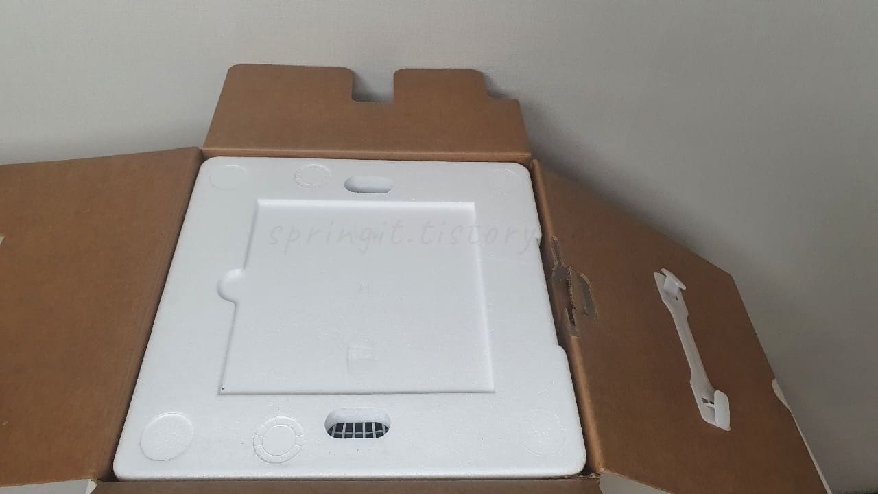 박스를 모두 구경한 후 드디어 개봉을 시작했습니다. 샤오미 미에어 공기청정기의 경우 상단부를 개봉하시면 됩니다. 추후에 AS나 중고판매를 할수도 있기 때문에 박스는 최대한 손상이 가지 않게 이음새 부분만 끌어내서 오픈해주었습니다. 먼저 상단에 보이는 스티로폼을 빼주시면 되겠습니다.