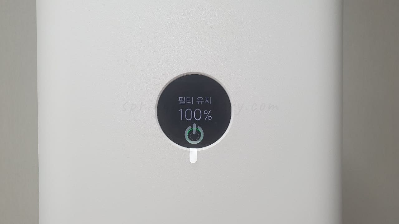 이제 전원버튼을 누르면 샤오미 미에어 3H가 가동을 시작하게 됩니다. 초기에 보여지는 화면은 필터의 수명인데요. 첫 개봉기인만큼 필터는 100%입니다. 나중에 0%로 보여질 때는 새로운 필터를 구매한 후 갈아주시면 됩니다.