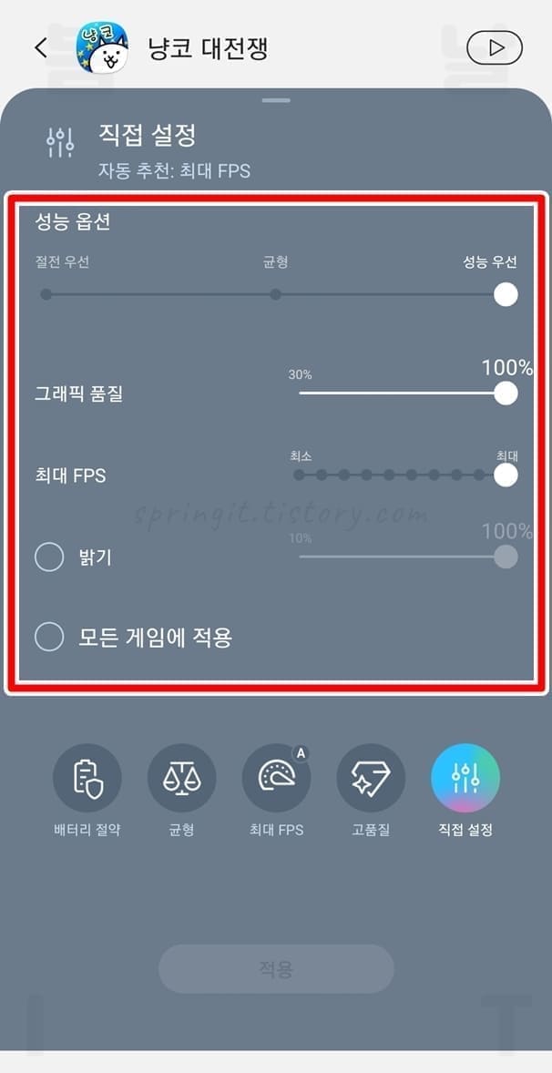 - 모든게임에 적용: 체크시 현재 설정한 성능이 모든 게임에 반영됨
