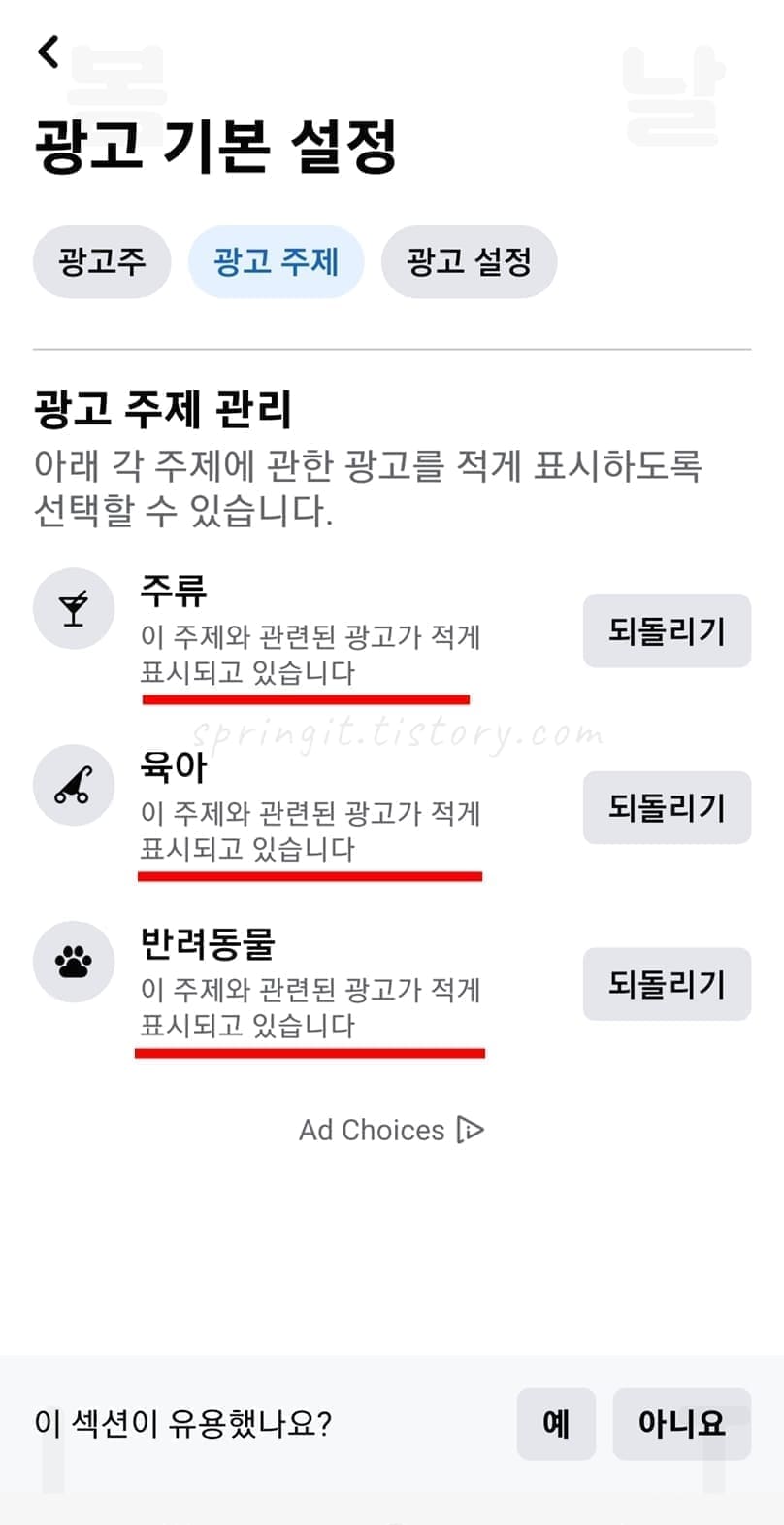페이스북의 광고에는 큰 카테고리로 주류, 육아, 반려동물이 있습니다. 이 주제들을 최대한 적게 표시하도록 설정해주시면 거의 나오지 않거나 완전히 나오지 않게 차단됩니다.
