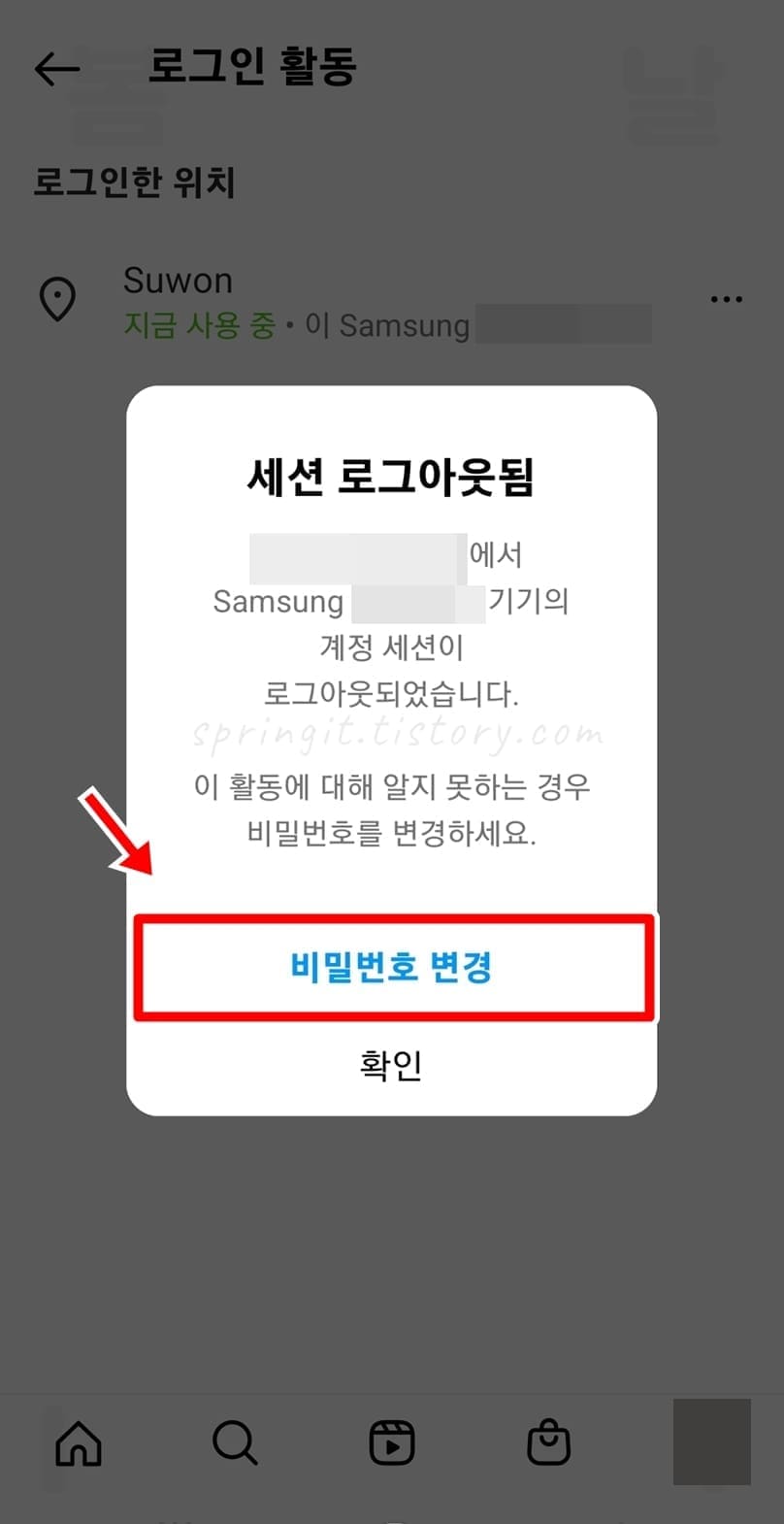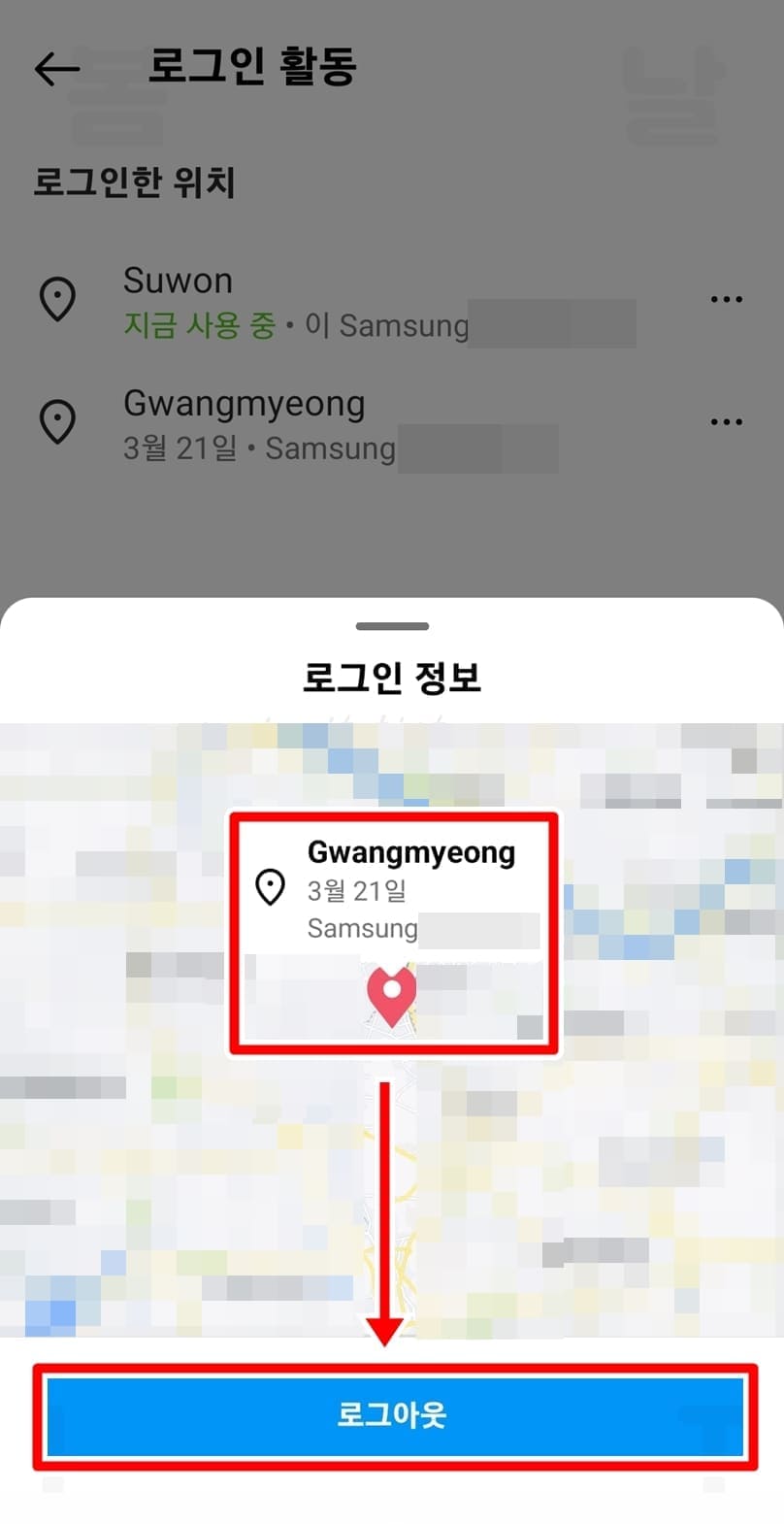 로그인 정보의 위치가 대한민국이 아닌 해외가 뜨거나 내가 가지고 있지 않은 디바이스라면 100% 이미 해킹을 당한 것입니다. 위의 방법으로 확인하셨다면 즉시 로그아웃한 후에 비밀번호를 바꿔주세요. 그 후에는 아래 2단계 인증까지 설정하는 것을 추천드립니다.