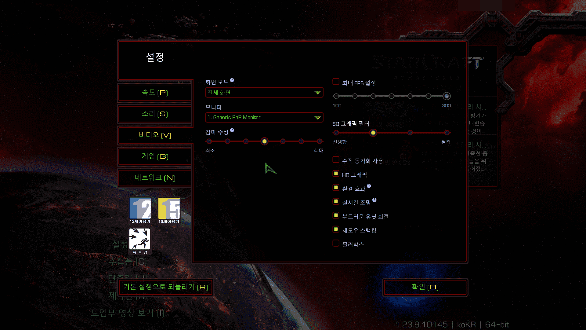 하지만 1.19버전 업데이트가 이루어지고 나서는 모니터 화면에 맞춰 스타크래프트를 전체화면으로 설정하는 것이 가능해졌습니다. 이제 큰 화면에 풀스크린으로 스타크래프트를 즐길 수 있게 된 것이죠. 이러한 스타크래프트 전체화면 설정은 게임을 플레이 하기 전이라면 설정창을 이용하시면 되고, 게임중이라면 스타크래프트 전체화면 단축키를 이용해보시길 바랍니다.