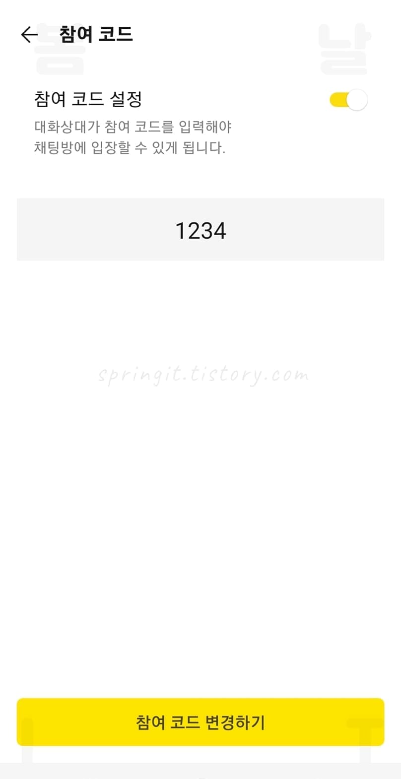 이제 다른 상대방이 나의 카톡 오픈채팅 프로필을 클릭해서 1:1 대화를 누르면 참여코드 입력창이 뜨게 됩니다. 참여코드를 알고 있는 상대방은 나와 1:1채팅을 할 수 있지만 모르는 사람은 대화방을 만들 수가 없게 됩니다.