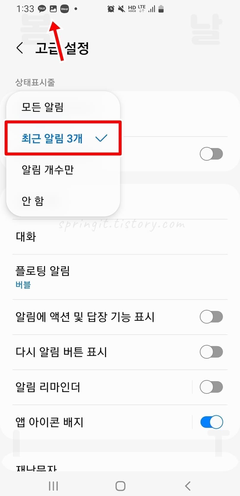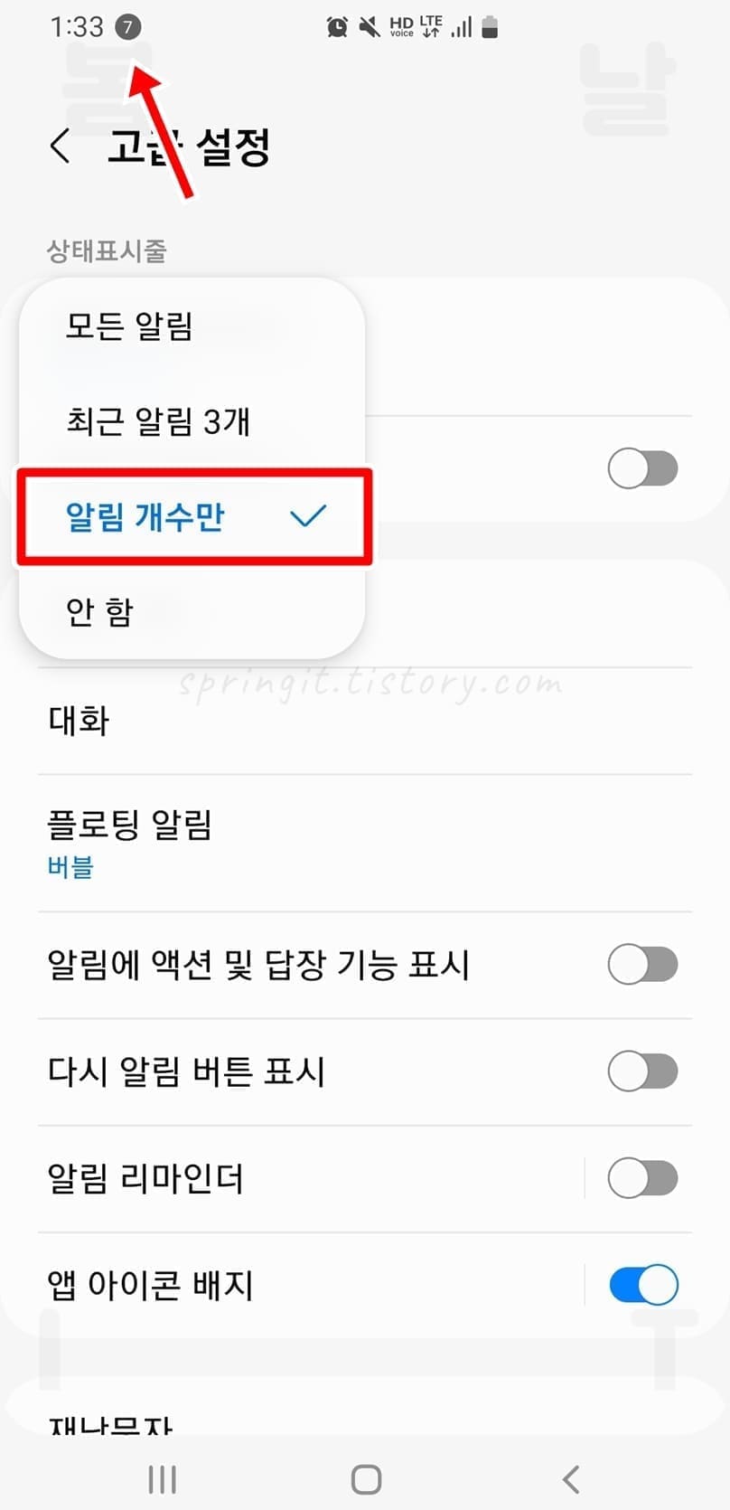 ▶ 알림 개수만으로 설정하면 갤럭시 상태표시줄에 내가 확인하지 않은 알림앱의 갯수(숫자)가 표시됩니다.