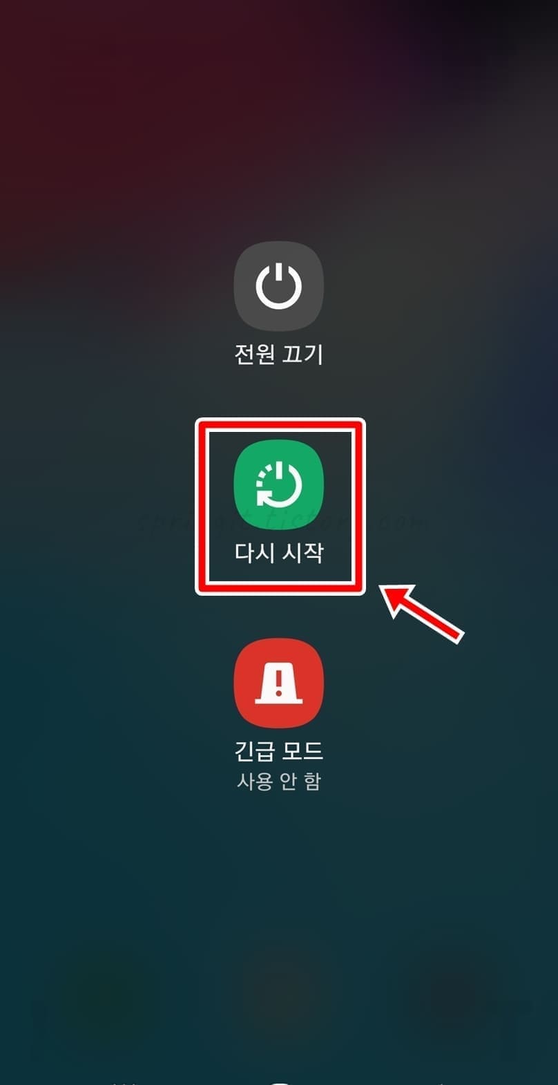 스마트폰의 웬만한 오류 문제는 재시작(재부팅)으로 해결할 수 있습니다. 삼성 서비스센터에서도 권장하는 방법이기 때문에 한번 시도해보시길 바랍니다. 전원버튼을 길게 누른 후 다시 시작을 클릭하시면 됩니다.