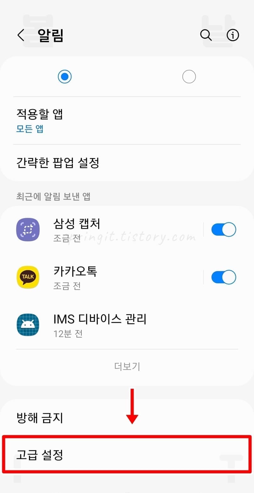 1. 설정 앱 > 알림 > 고급 설정을 들어갑니다.