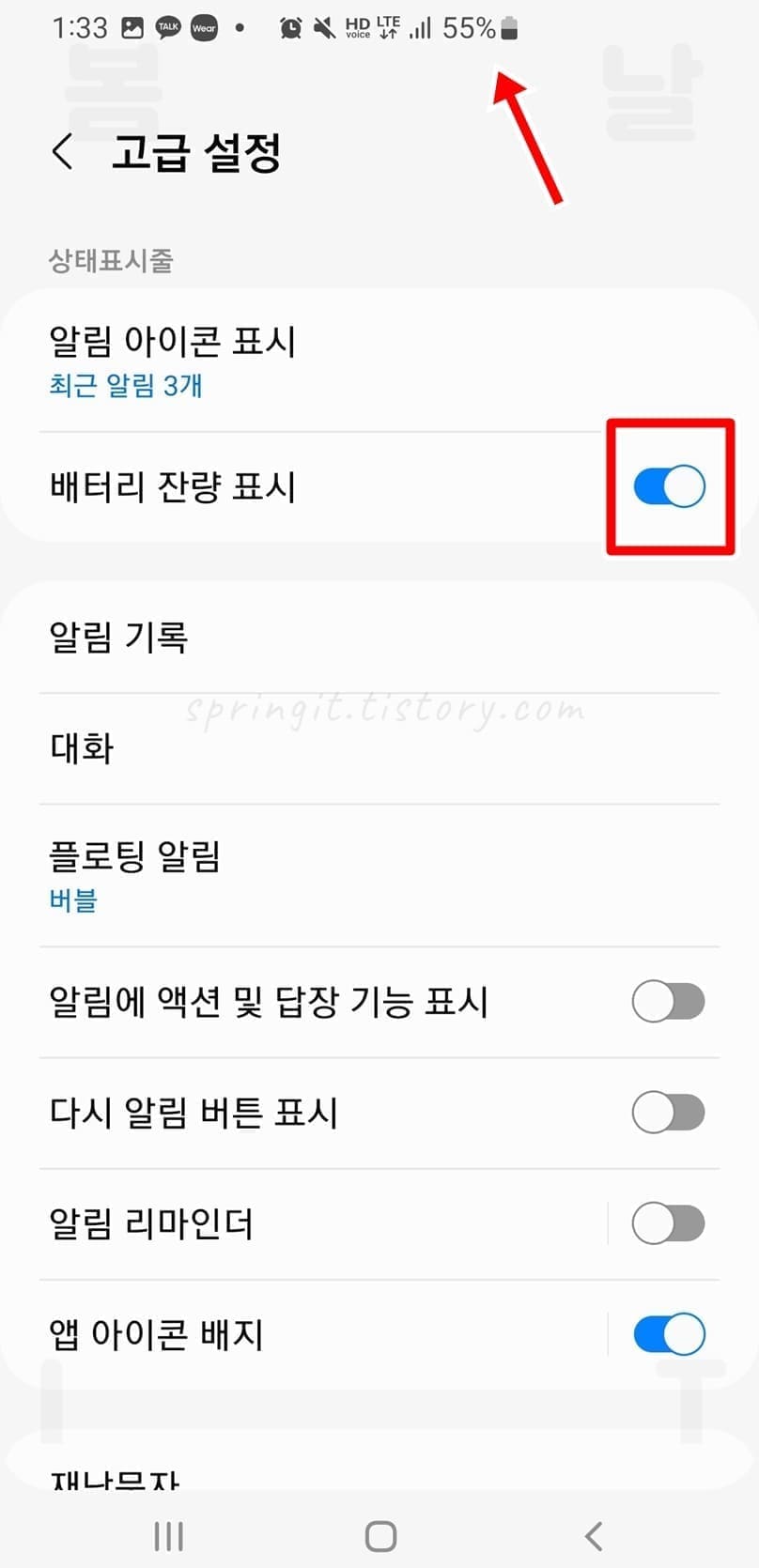 2. 배터리 잔량 표시의 토글을 눌러 활성화합니다.
