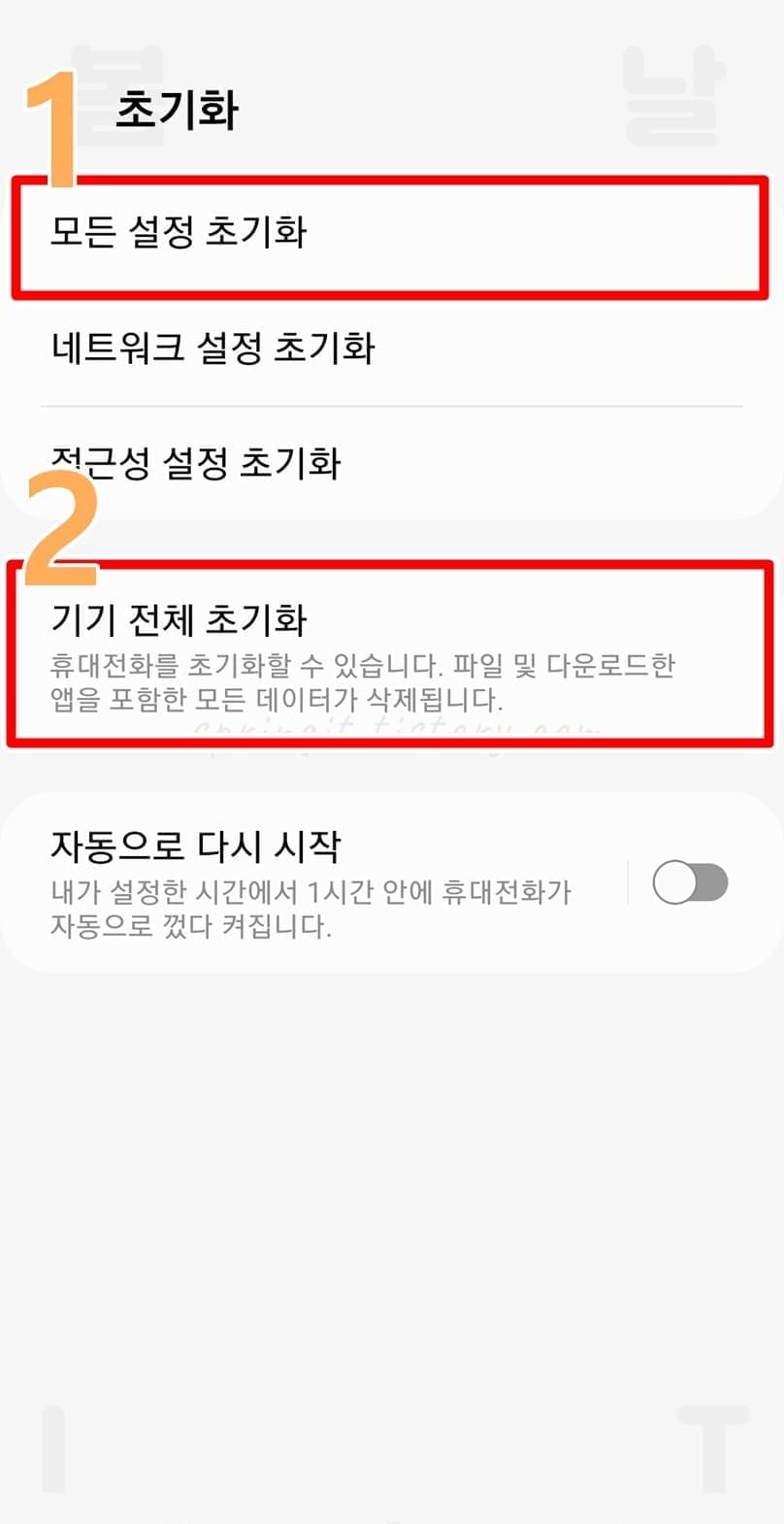 모든 설정 초기화를 진행하고 나서도 상태표시줄(상단바) 안보인 오류가 해결되지 않았다면 마지막으로 기기 전체 초기화를 사용하시면 됩니다.