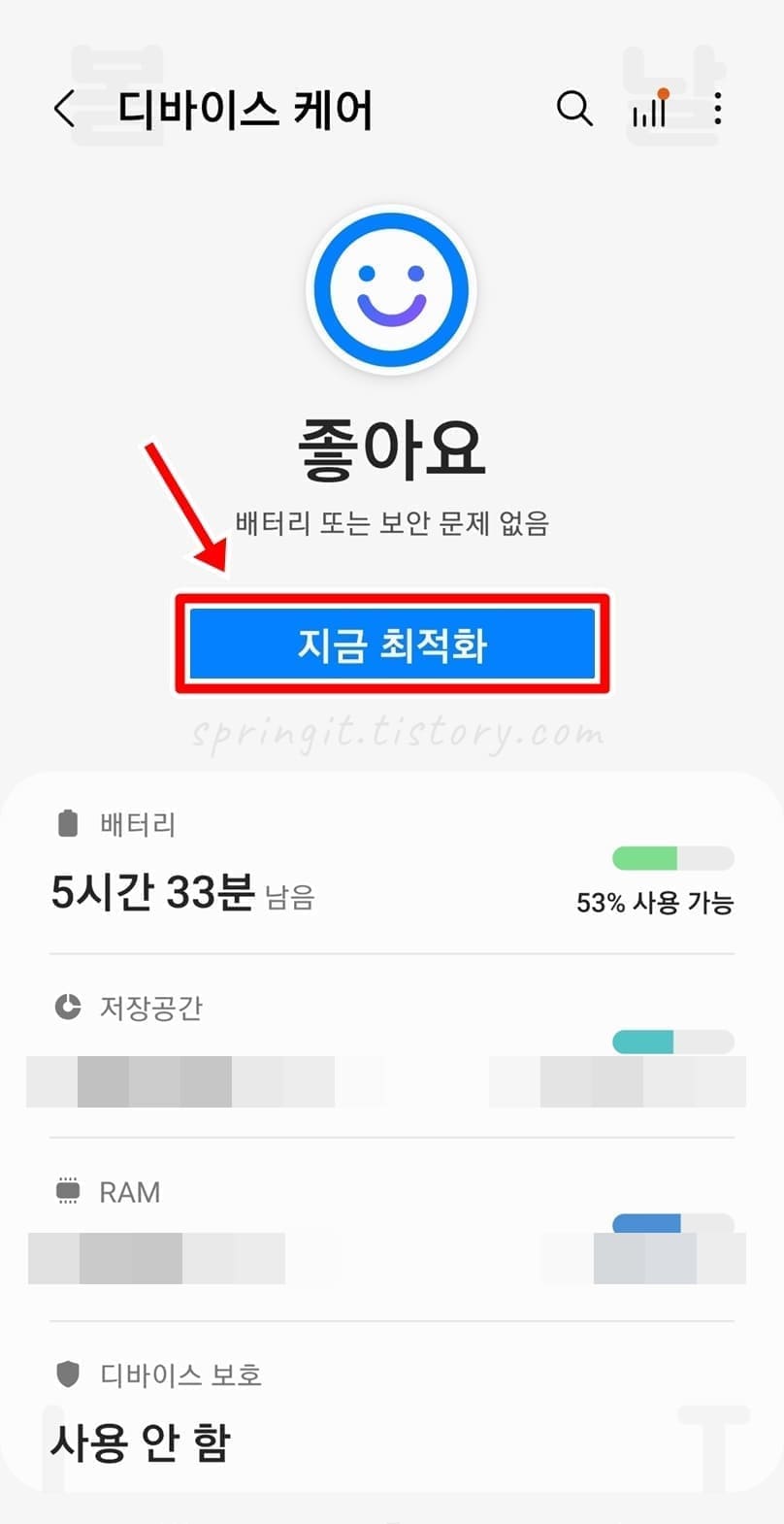 스마트폰에서 앱과 설정간 충돌이나 오류가 발생할 경우 상태표시줄 및 상단바의 기능들이 보여지지 않을 수 있습니다. 이럴 때에는 최근 다운로드 받은 앱을 삭제해보시거나 아래의 방법으로 최적화시켜 쉽게 상태표시줄(산단바) 안보임 문제를 해결할 수 있습니다.
