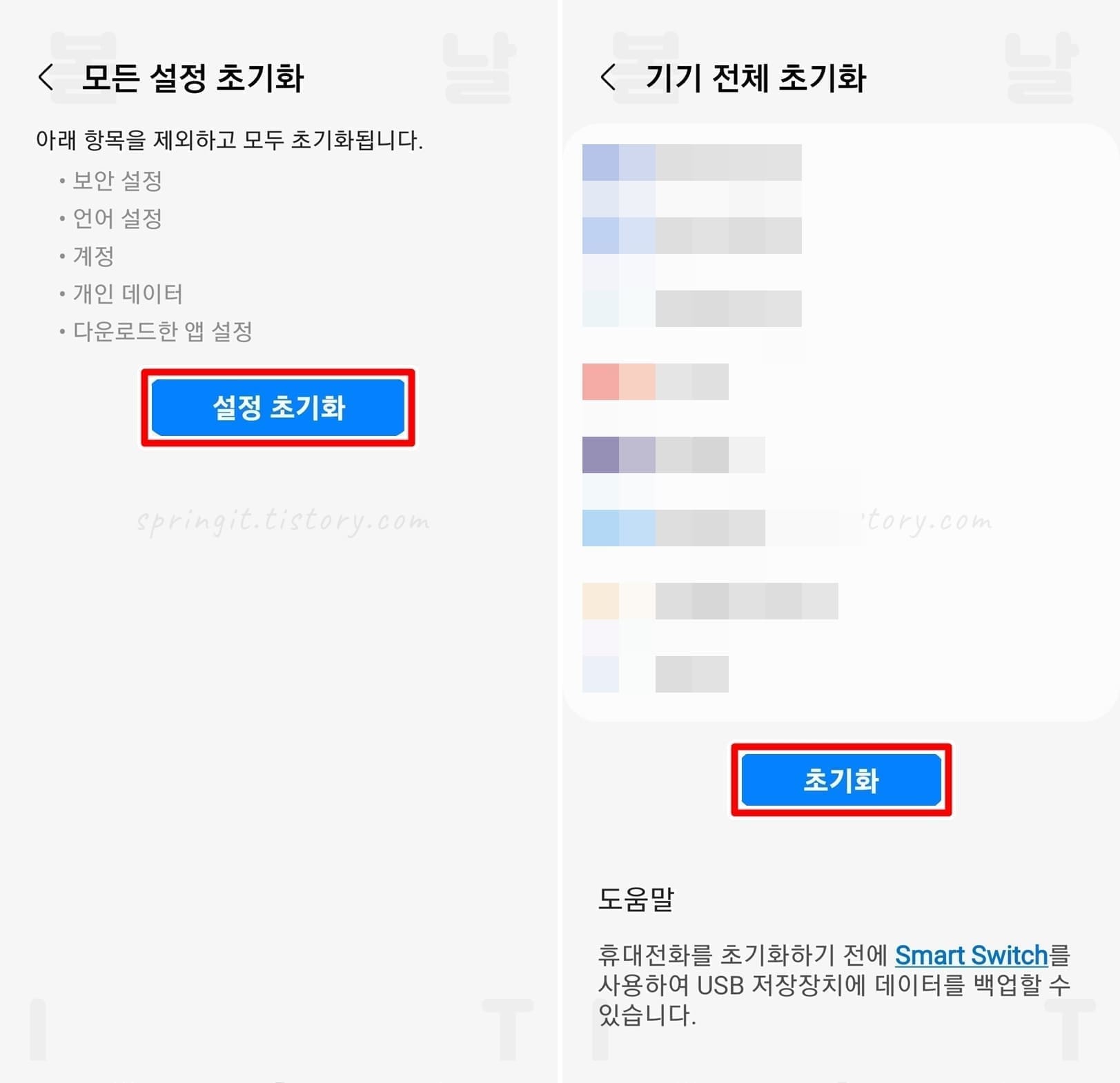 기기 전체 초기화를 진행할 경우 현재 스마트폰에 다운로드 받은 앱, 파일, 폴더가 모두 없어지고 스마트폰을 처음 사용했던 초기 기본값으로 모두 되돌아가게 됩니다. 그렇기 때문에 주요한 정보들은 모두 백업해서 저장하신 후 진행하시길 바랍니다.