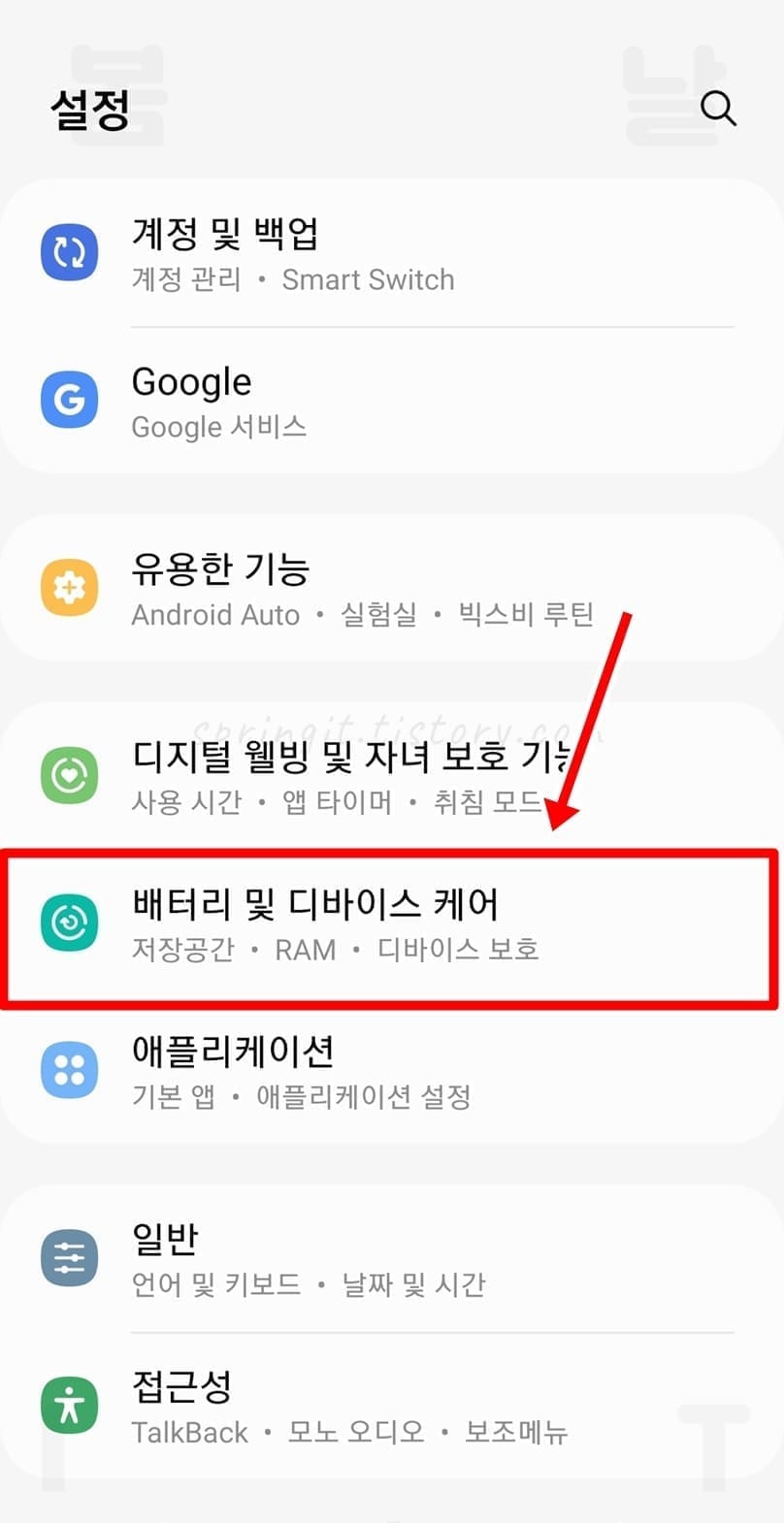 1. 설정 앱에서 배터리 및 디바이스 케어를 클릭합니다.