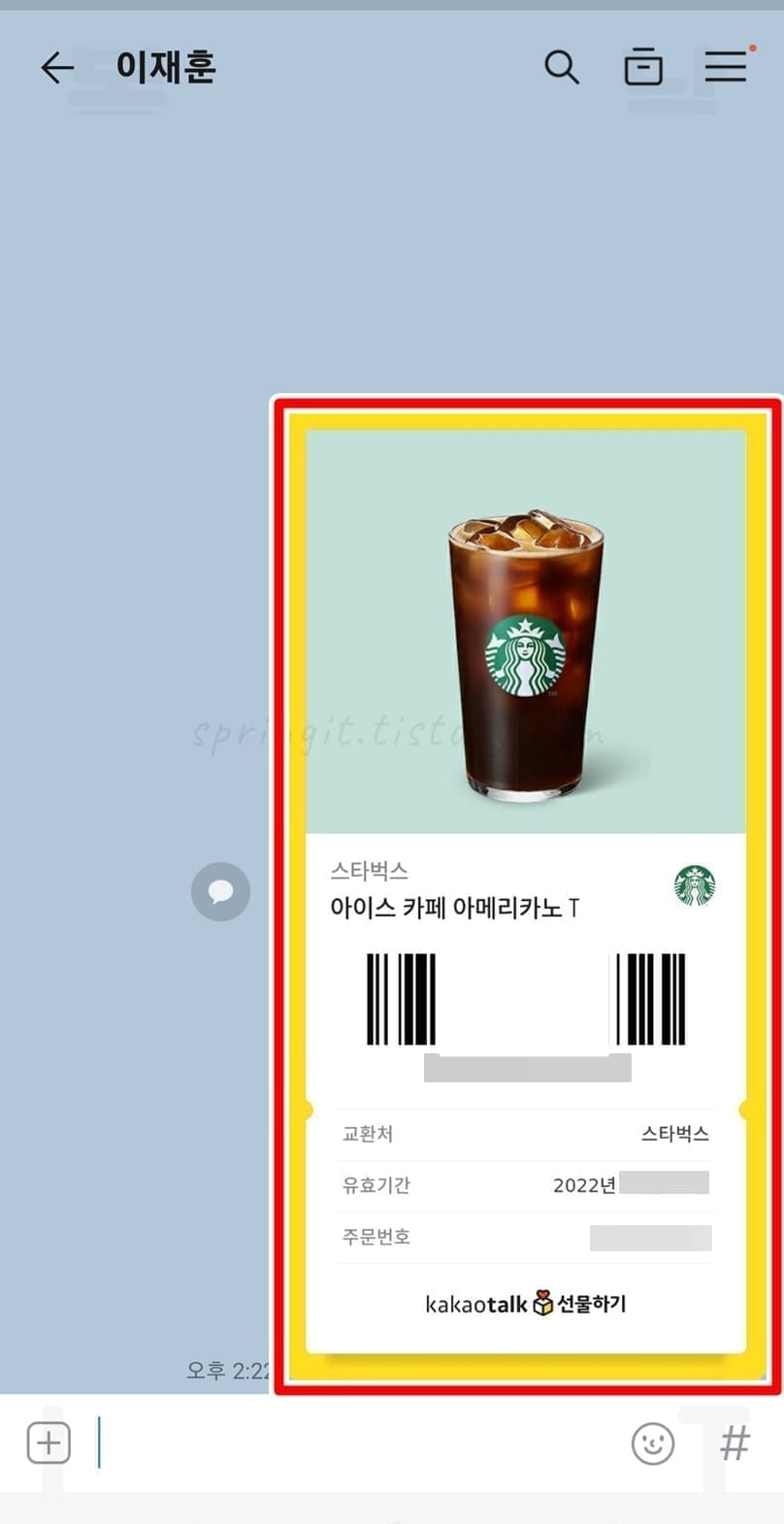 기프티콘에는 매장 점원이 찍어야하는 바코드, 기프티콘 고유번호, 유효기간 주문번호가 적혀져있습니다.