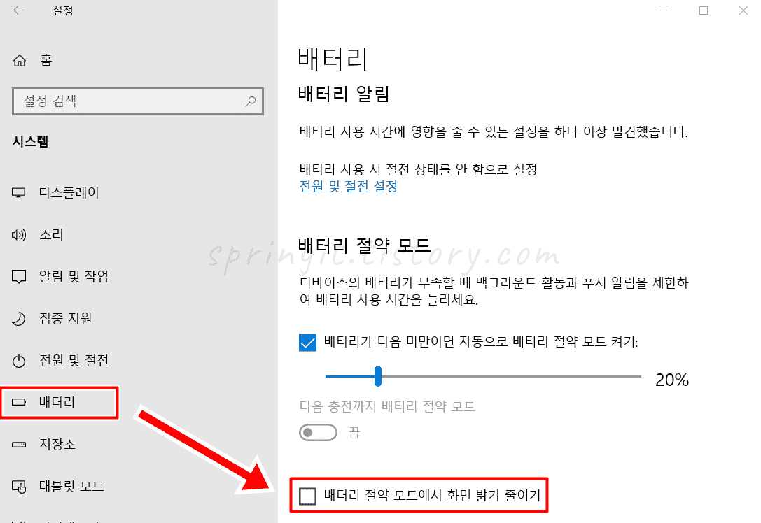 4. 배터리 절약 모드에서 화면 밝기 줄이기 기능을 체크 해제해주세요.