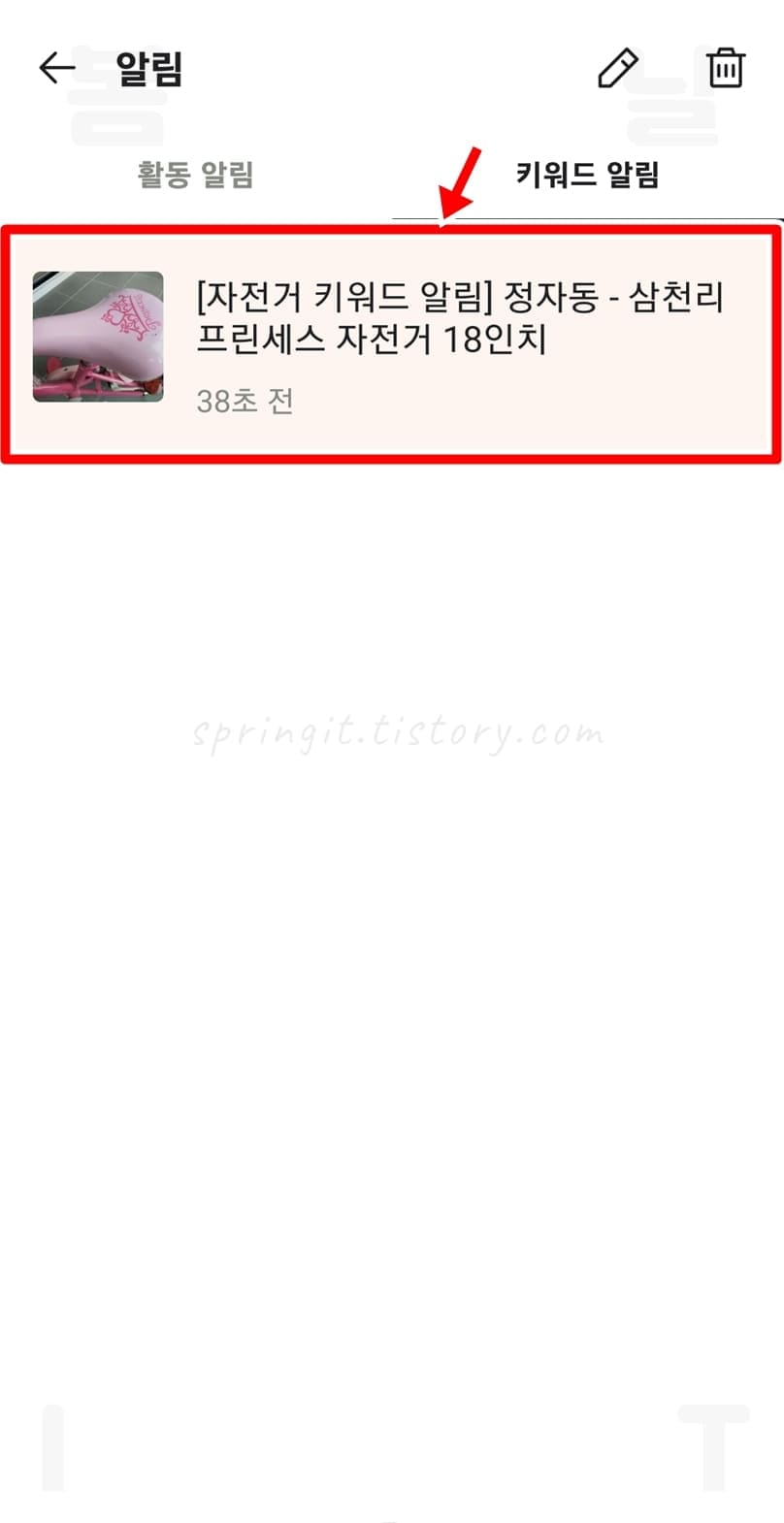 이렇게 등록한 키워드 단어가 포함된 제목, 내용이 적힌 중고거래가 올라오면 이제 스마트폰 팝업 알림과 함께 당근마켓 인 앱에서 알림을 받을 수 있습니다. 누구보다 빠르게 해당 글을 확인하고 연락해서 구매할 수 있다는 것입니다.