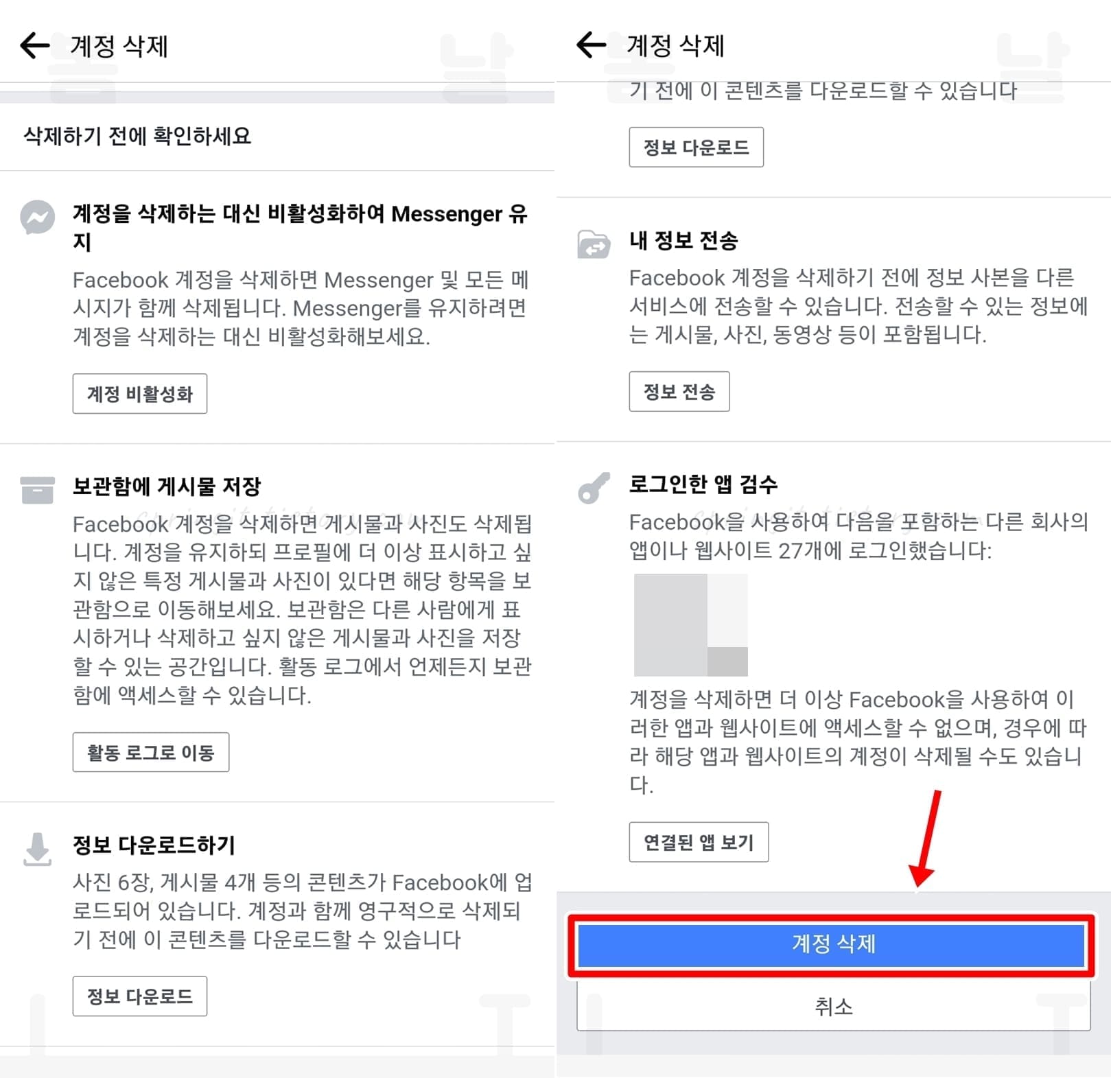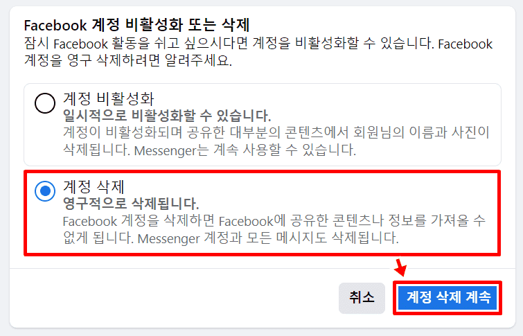-계정삭제는 영구적입니다. 페이스북 계정을 탈퇴하면 공유한 콘텐츠나 정보를 가져올 수 없게 됩니다. 또한 메신저 계정과 모든 메시지도 삭제됩니다.