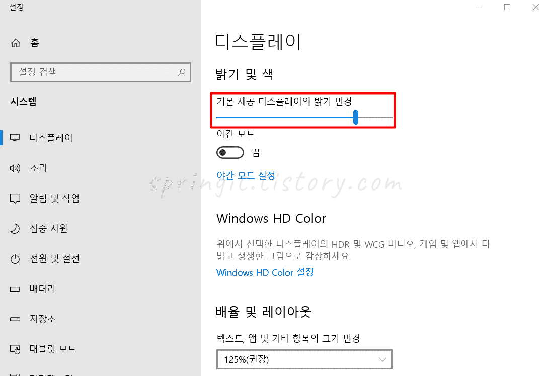 3. 기본 제공 디스플레이의 밝기 변경의 값을 조절해주시면 됩니다.