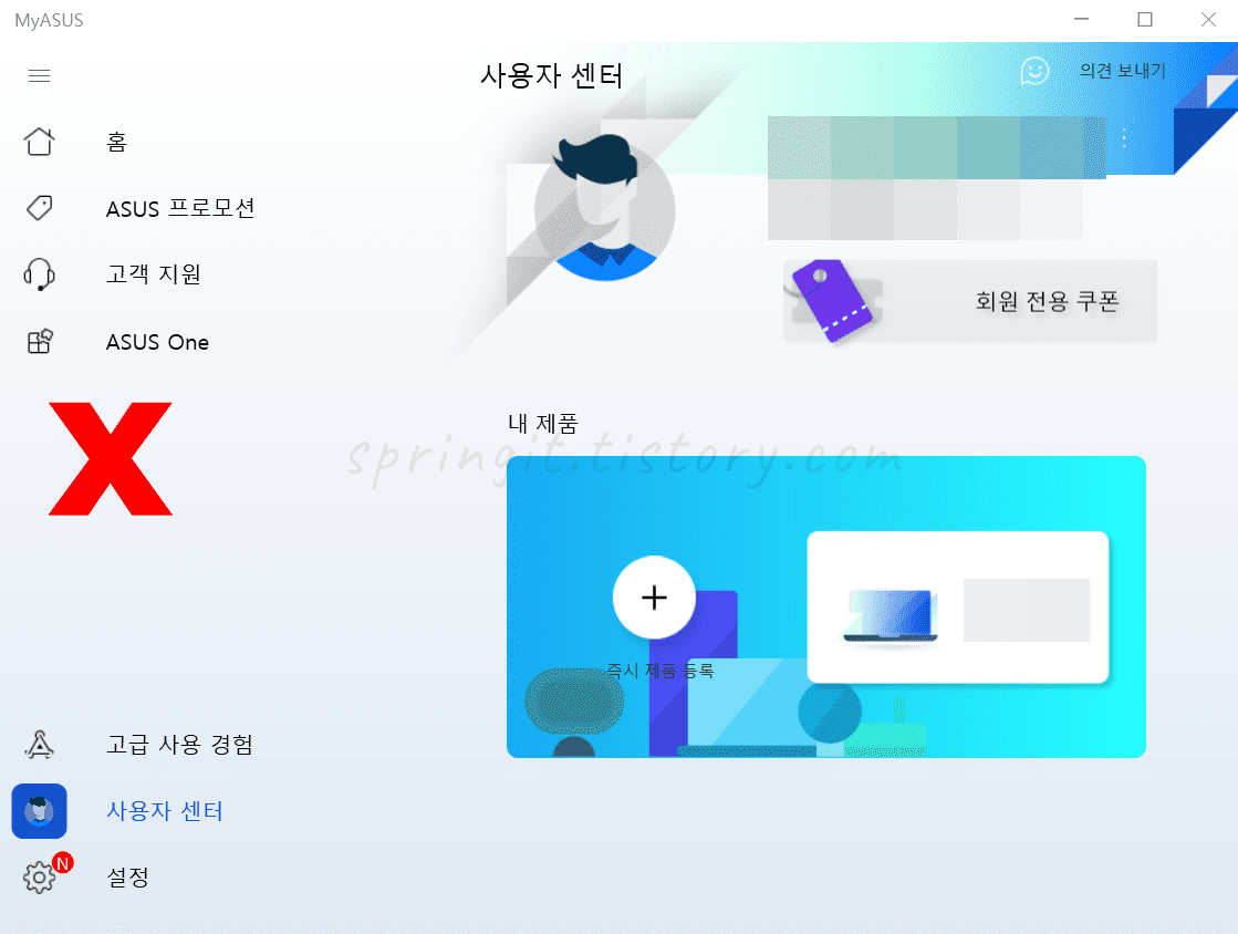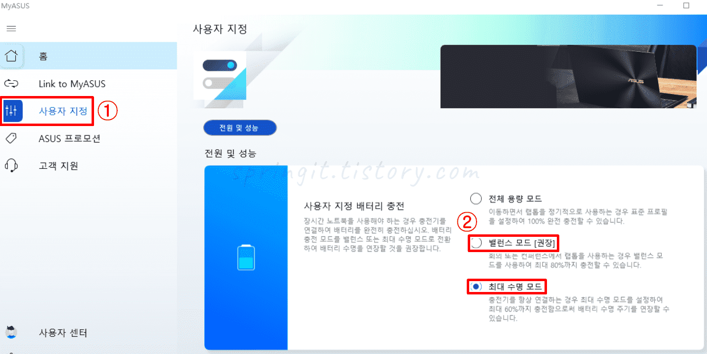 중요★- MYASUS에 로그인을 하였고 노트북 정보가 보여도 좌측 카테고리에서 사용자 지정이나 배터리 관련 메뉴가 보이지 않는다면 MYASUS로 노트북 배터리 충전 제한 기능을 지원하지 않는 노트북을 의미합니다. 이 경우에는 아래 방법을 이용해주세요.