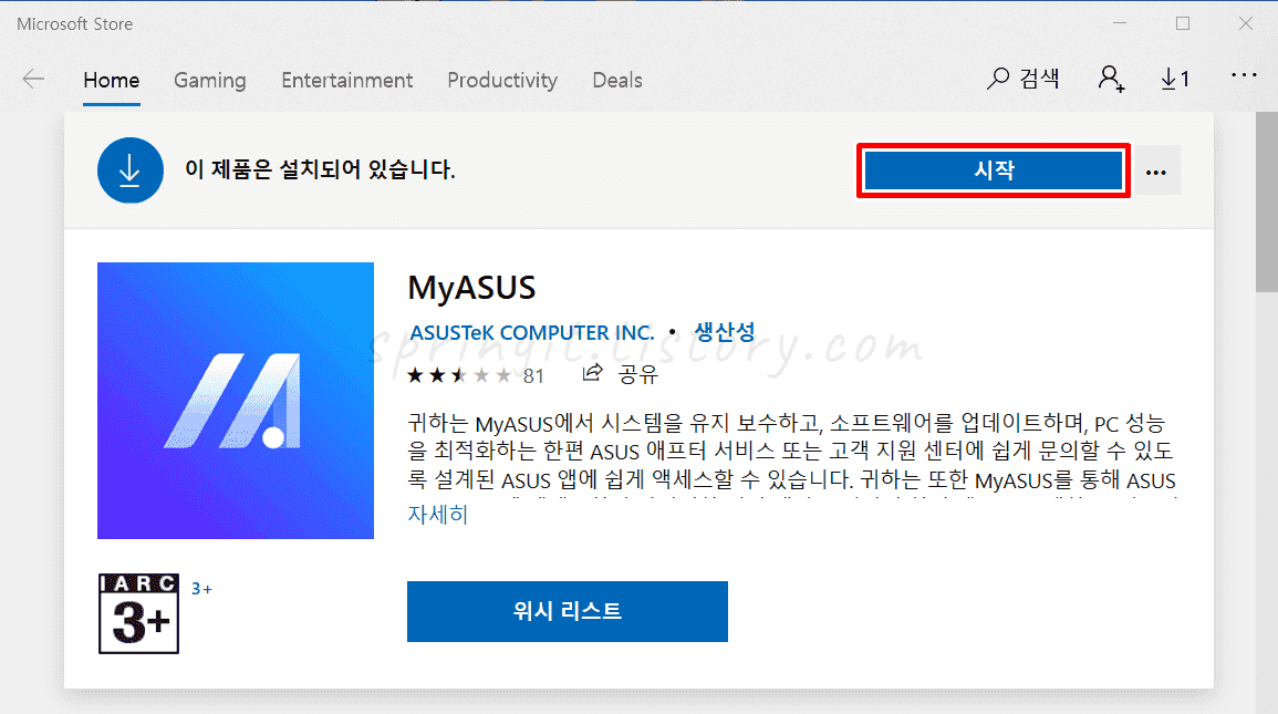 6. MYASUS 프로그램이 설치되면 시작을 누릅니다.