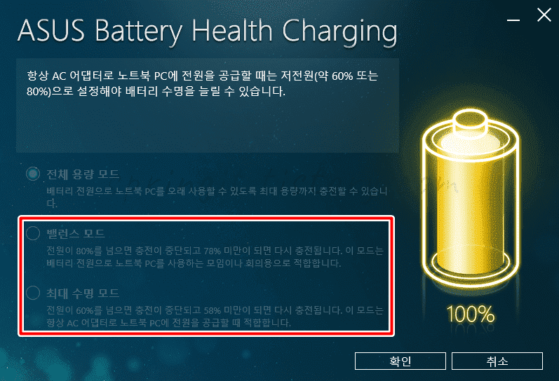 - 최대 수명 모드: 전원이 60%를 넘으면 충전이 중단되고 58% 미만인 되면 다시 충전됩니다. 이 모드는 항상 AC 어댑터로 노트북 PC에 전원을 공급할 때 적합합니다.