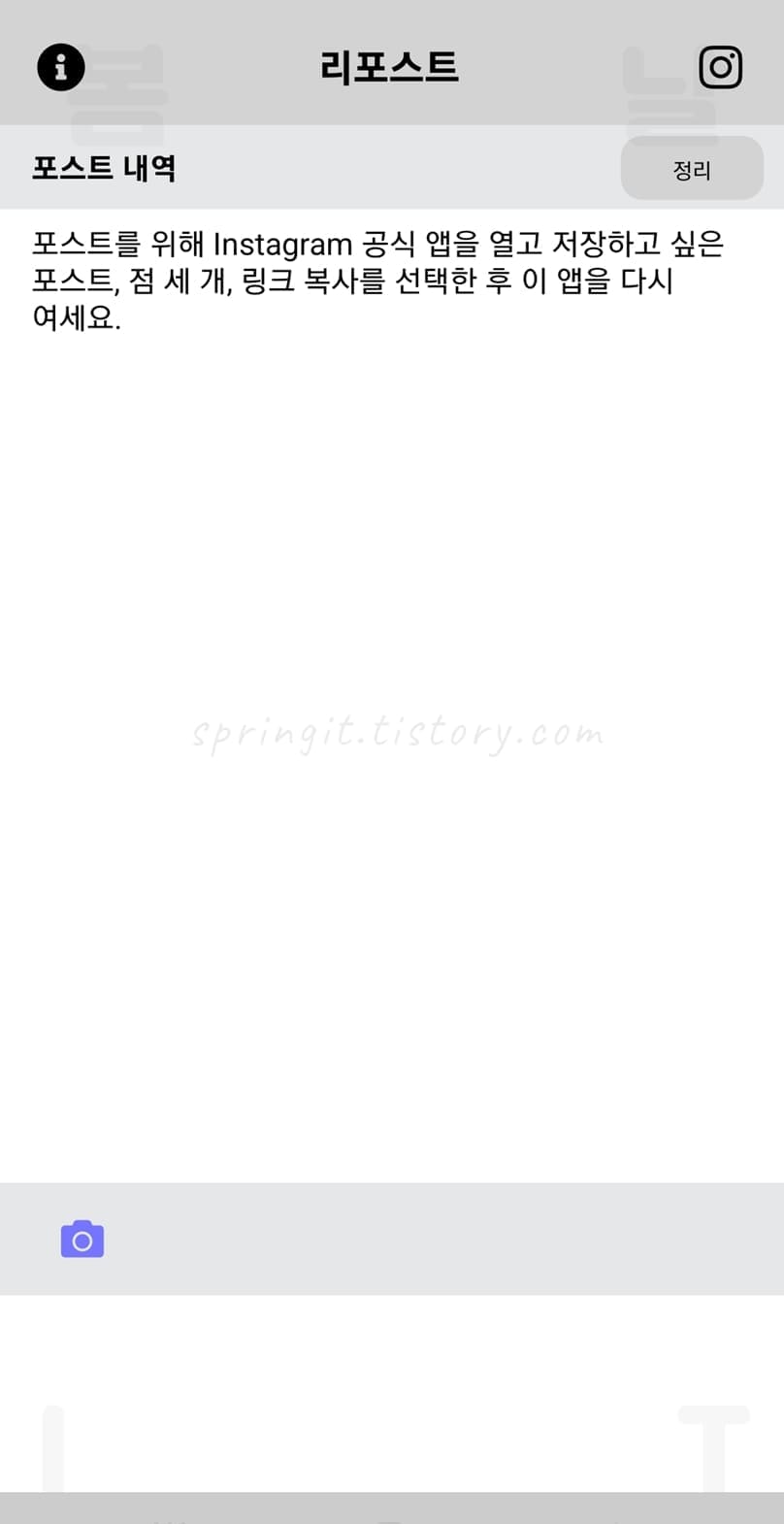 인스타 리그램을 지원하는 앱마다 사용방법이 조금씩 상이할 수는 있으나 기본적으로 모두 동일합니다. 리그램 방법을 읽어보면 '저장하고 싶은 포스트 점 세 개, 링크 복사를 선택한 후 앱을 실행하세요'를 볼 수 있었습니다. 그대로 따라 진행해보도록 하겠습니다.