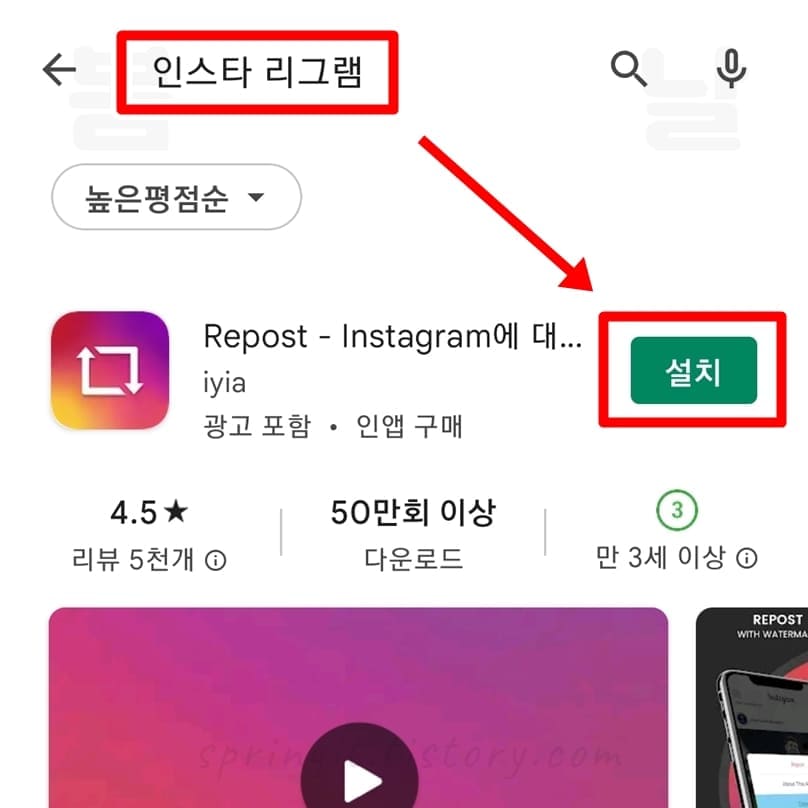 1. 구글 플레이 스토어에서 인스타 리그램을 검색합니다.
