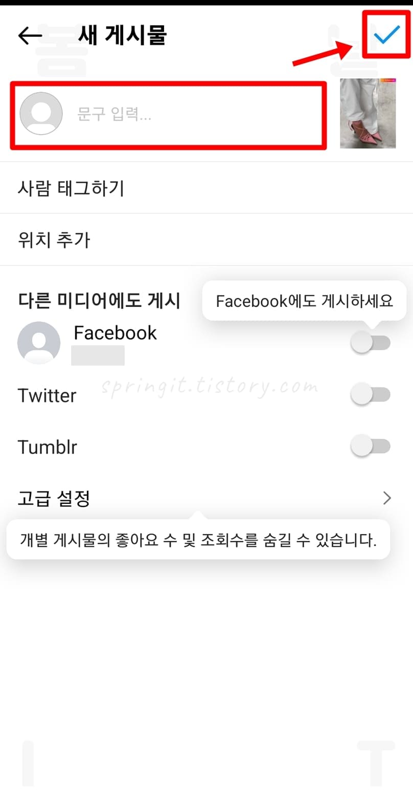 18. 리그램한 사진 게시물이 자동으로 첨부됩니다.