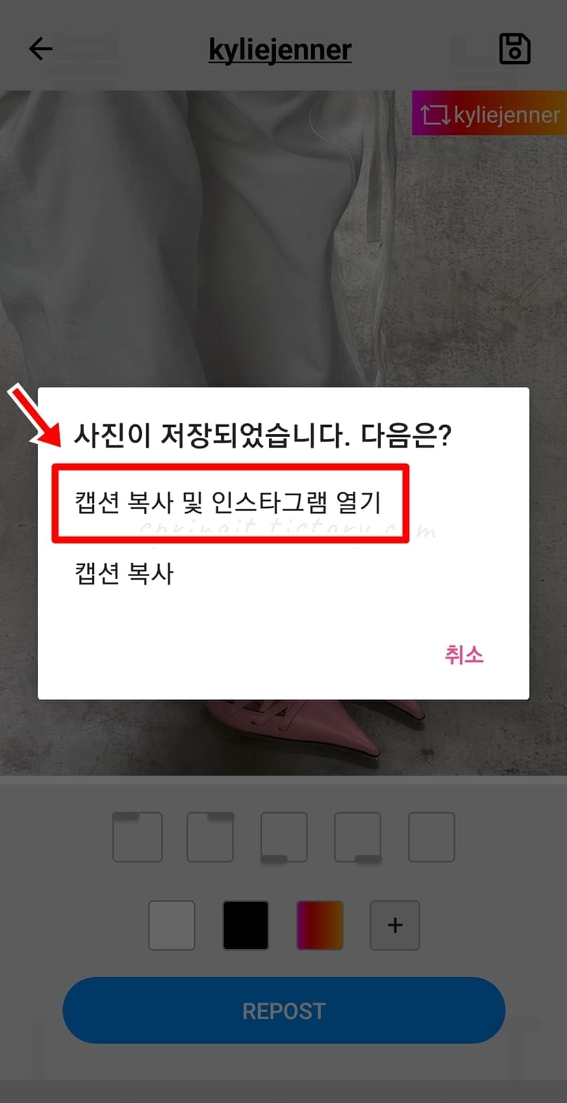 15. 캡션 복사 및 인스타그램 열기를 클릭합니다.