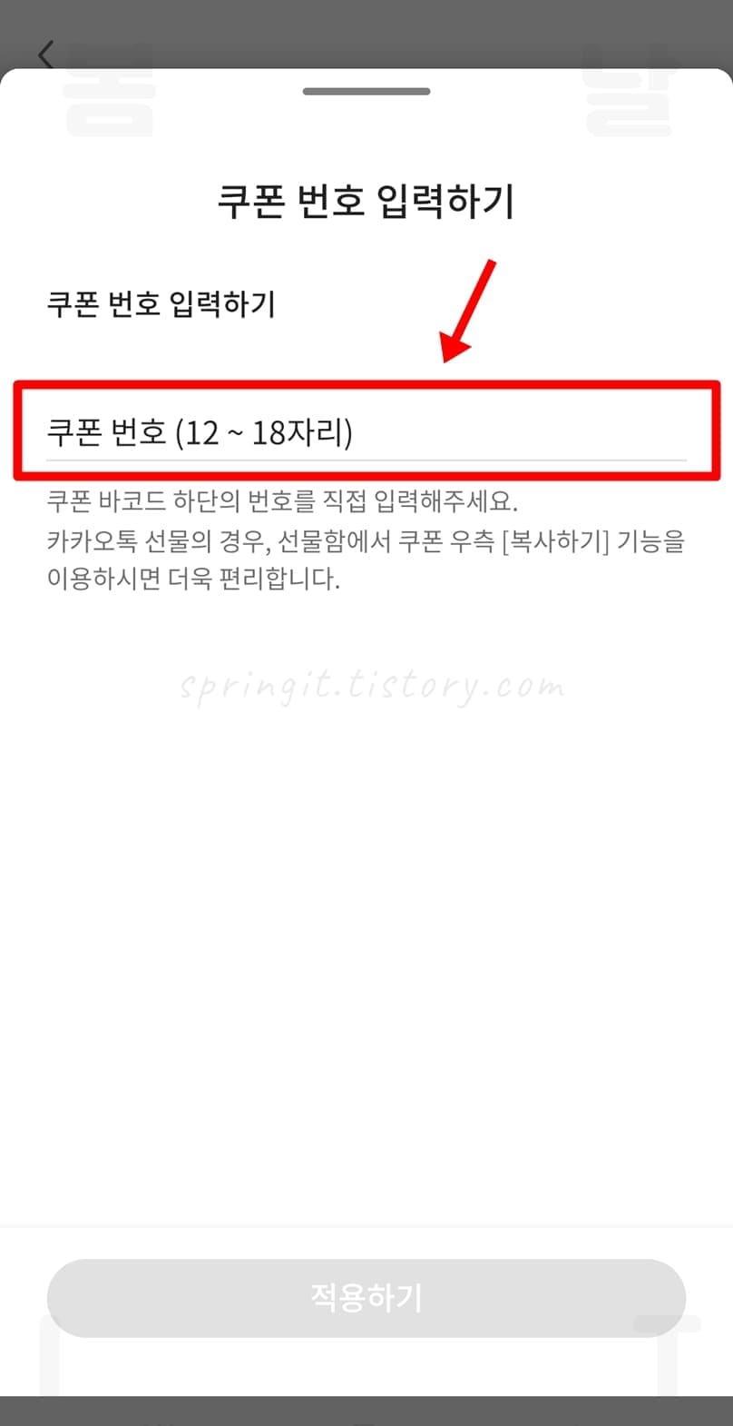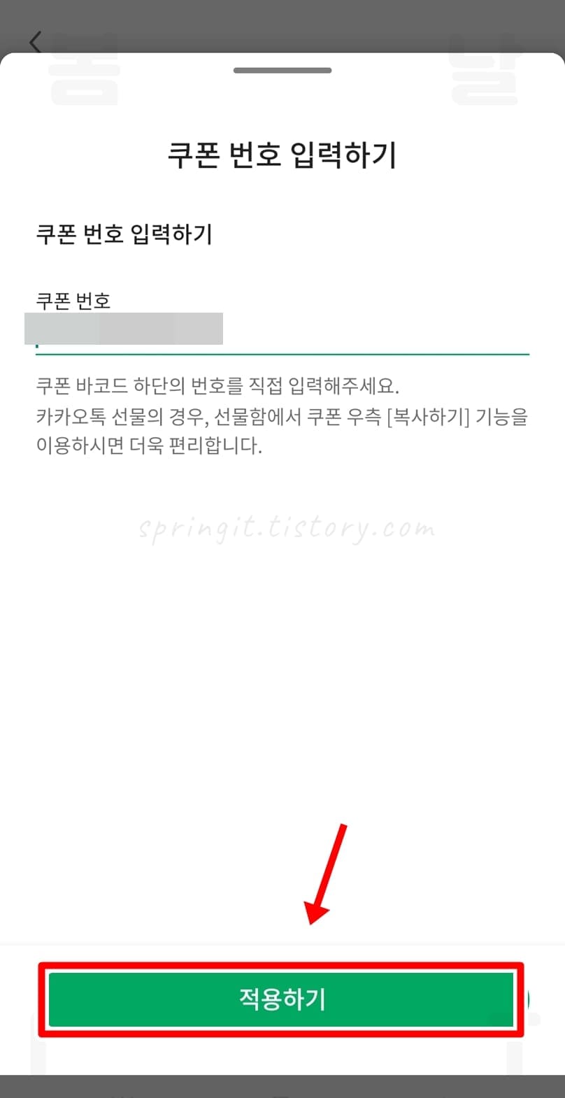 - 쿠폰 번호 입력하기: 카톡 스타벅스 기프티콘에서 주문 번호를 복사하신 경우 사용하며 복사된 번호를 붙여넣기로 입력해주시면 됩니다.