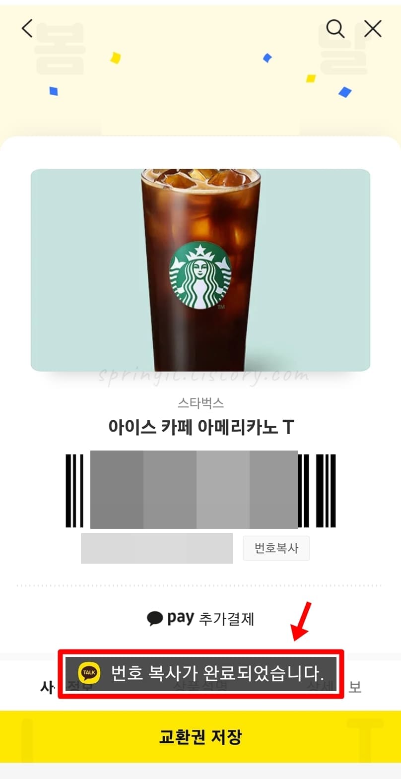 7. 번호복사를 누르거나 교환권 저장을 클릭합니다.