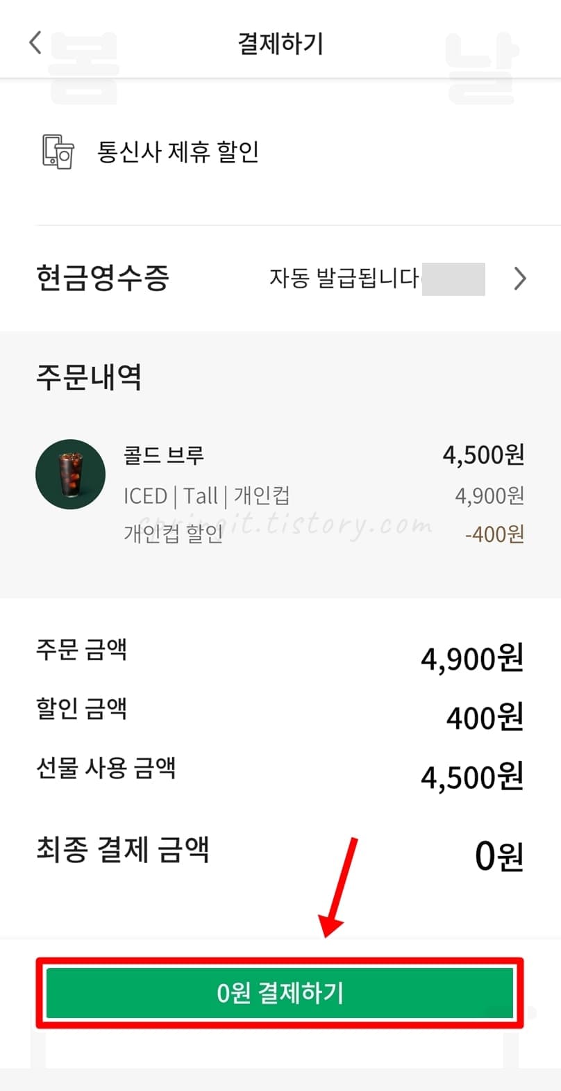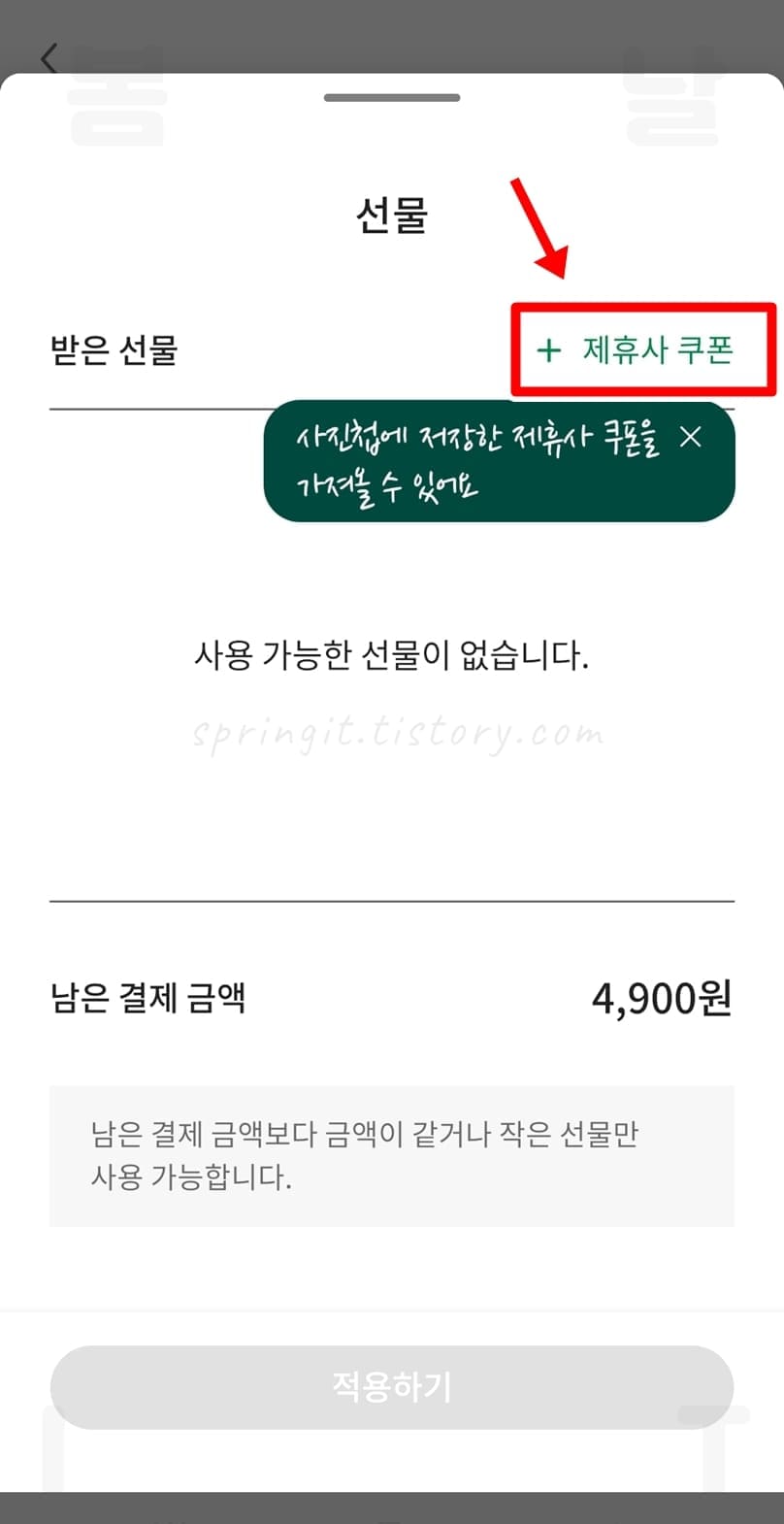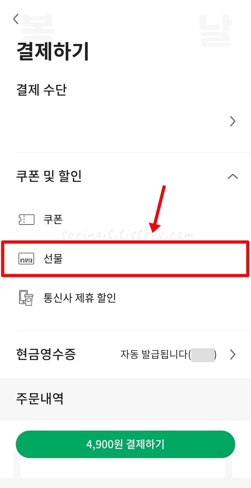 사이렌 오더 결제시 카톡 선물 교환권 등록하기