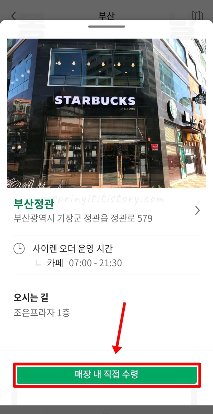 5. 매장 내 직접 수령을 클릭합니다.