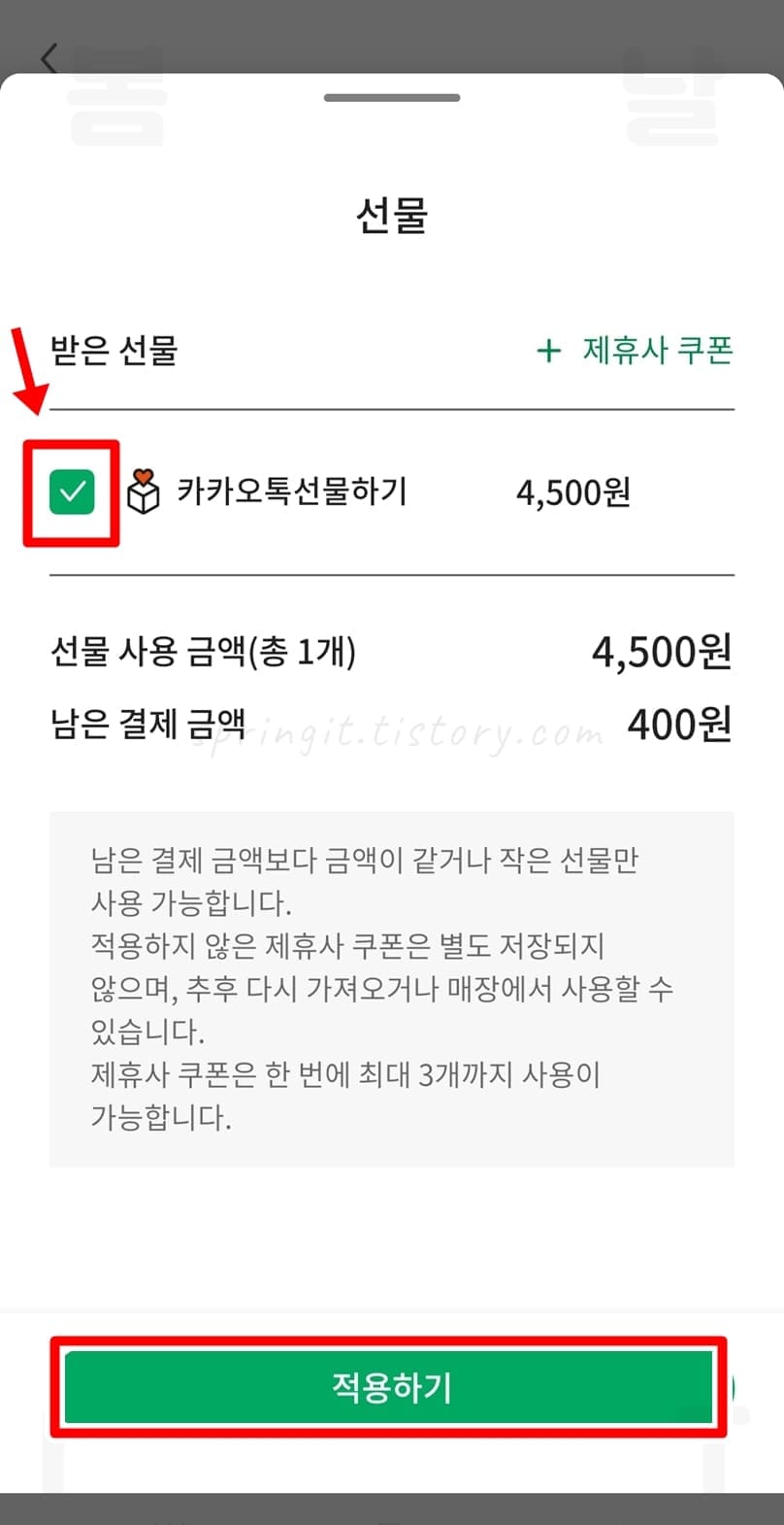 카카오톡 스타벅스 기프티콘 선물 등록 방법
