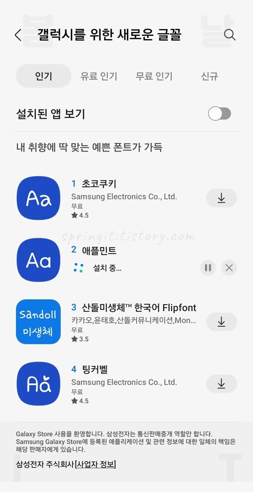 테마 메뉴에는 인기, 유료인기, 무료인기, 신규를 선택할 수 있습니다. 참고로 갤럭시 무료폰트의 종류도 매우 많기 때문에 굳이 유료글씨체를 사용하지 않으셔도 선택자유도가 높습니다.