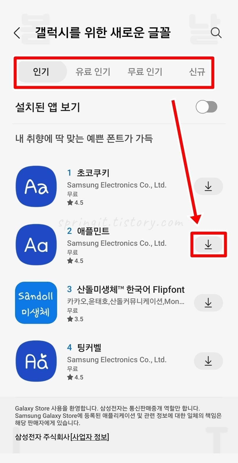 테마 메뉴에는 인기, 유료인기, 무료인기, 신규를 선택할 수 있습니다. 참고로 갤럭시 무료폰트의 종류도 매우 많기 때문에 굳이 유료글씨체를 사용하지 않으셔도 선택자유도가 높습니다.