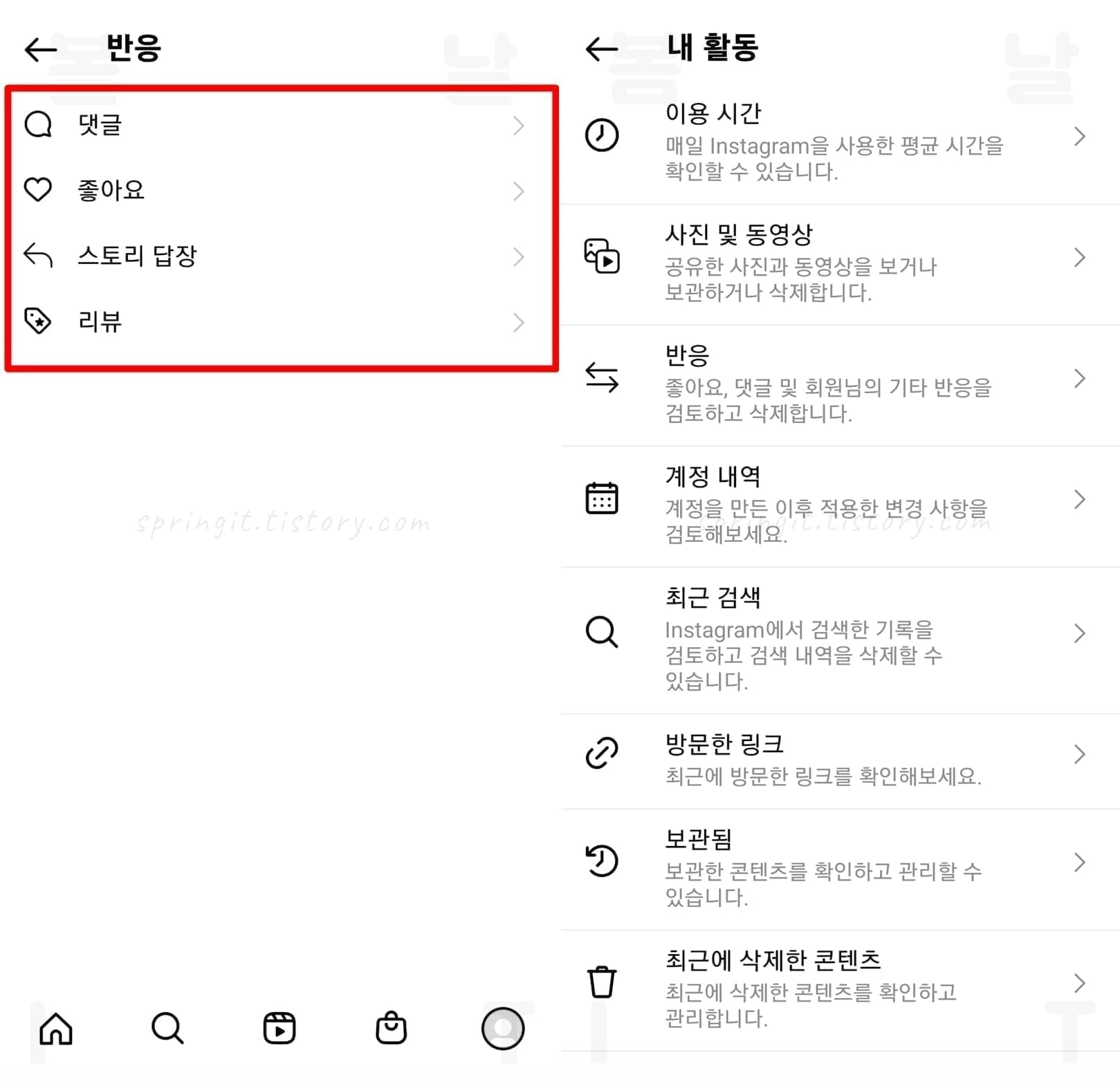 '더보기 버튼 > 내 활동 > 반응'에서는 인스타그램 좋아요 기록 확인뿐만 아니라 내가 단 댓글, 스토리 답장, 리뷰 내역도 조회하는 것이 가능합니다. 또한 내활동 메뉴에서는 다양한 계정 기능들을 이용해서 게시물을 삭제하거나 숨기는 것도 가능하니 쭉 둘러보신 후 이용해보시길 바랍니다.