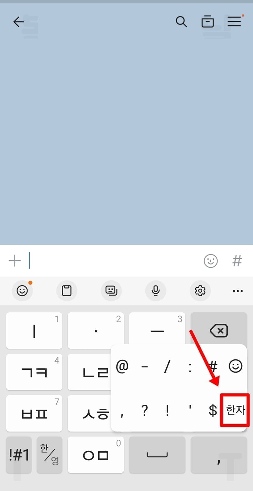 참고로 갤럭시의 기본 삼성 키보드는 천지인 키보드인데 다른 키보드 모양을 사용하고 계시다면 한자 전환 버튼 위치나 설정이 조금은 다를 수 있습니다. 하지만 갤럭시 한자 입력 방법은 모두 동일하기 때문에 해당하는 위치의 버튼으로 설정하시는 과정이 어렵지 않습니다.