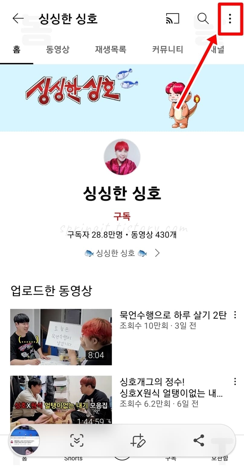 2. 채널 페이지에서 상단 우측 더보기 버튼을 클릭합니다.