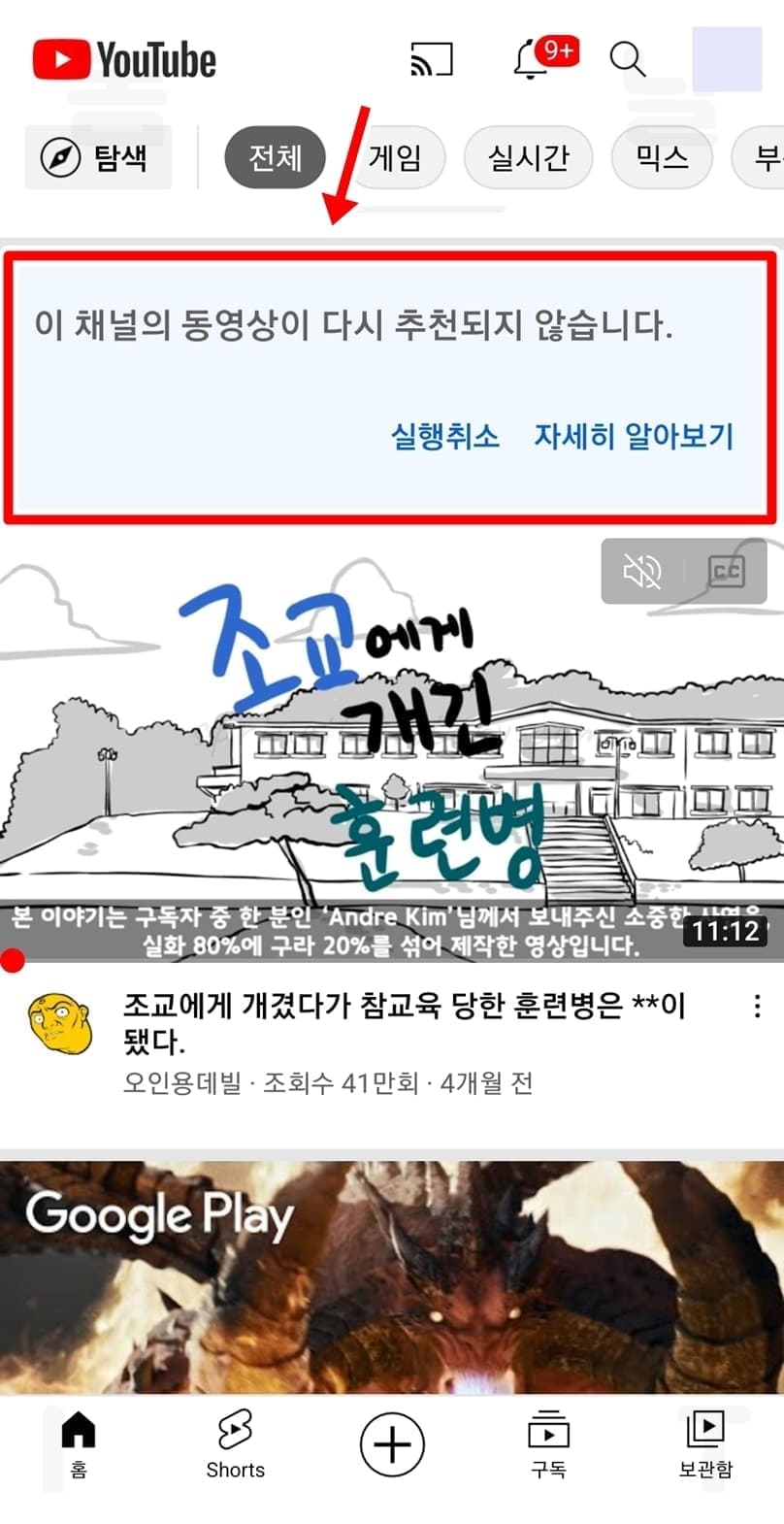 모바일에서 특정 동영상 숨김 또는 채널 추천안함 설정하기