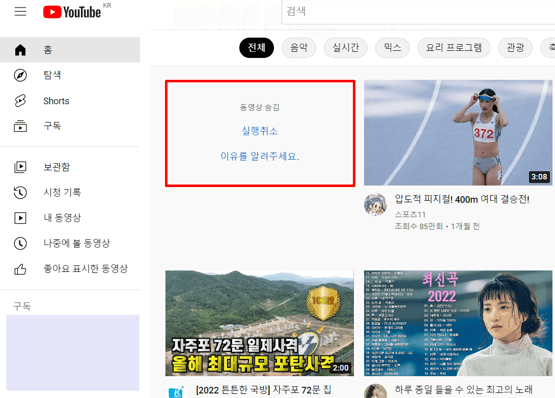 PC에서 동영상 숨김 및 채널 추천안함 해제하는 방법 (다시 표시)