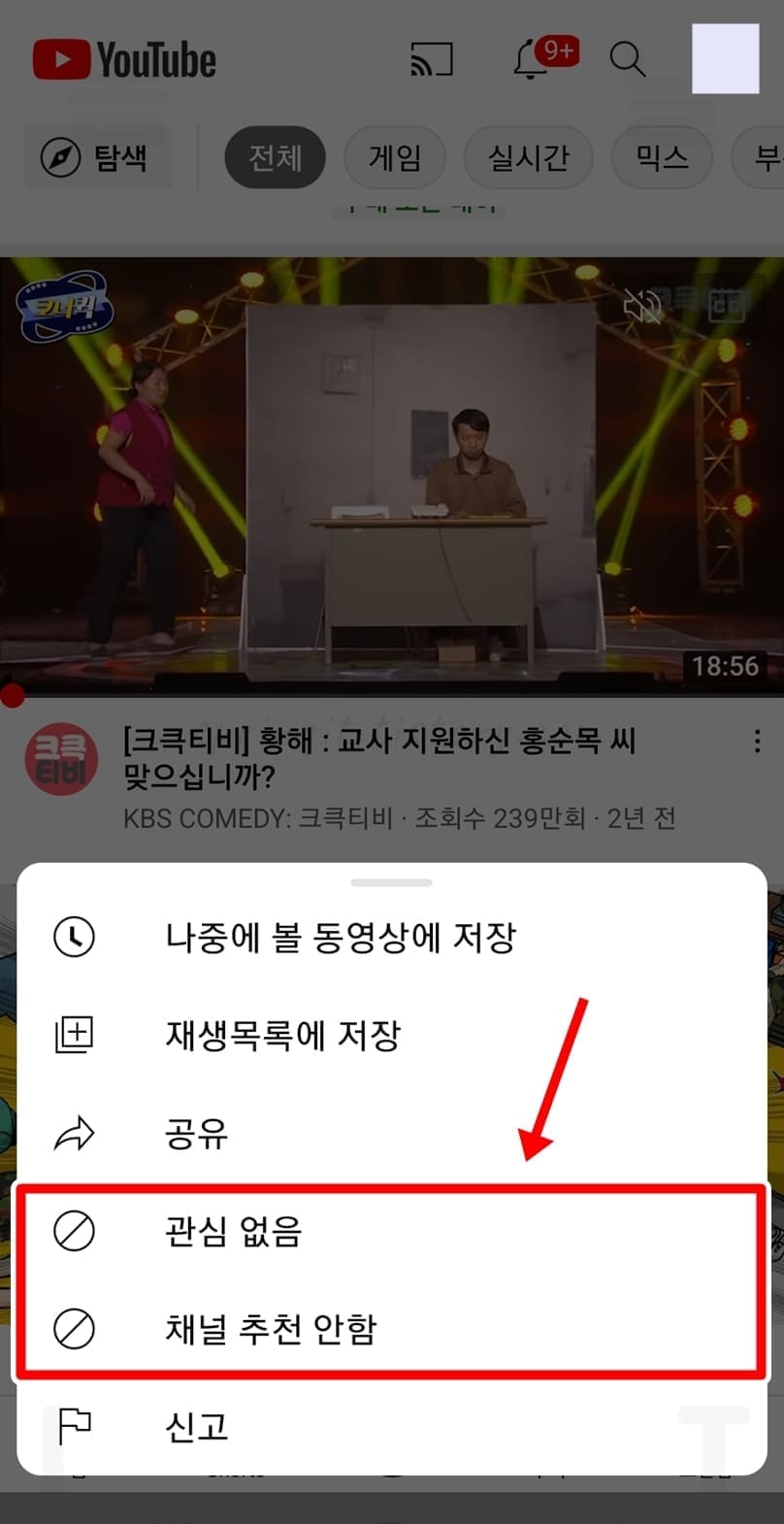 2. 관심없음 또는 채널 추천 안함을 선택합니다.