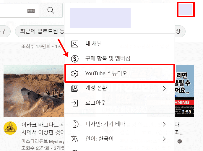 2. YouTube 스튜디오를 누릅니다.