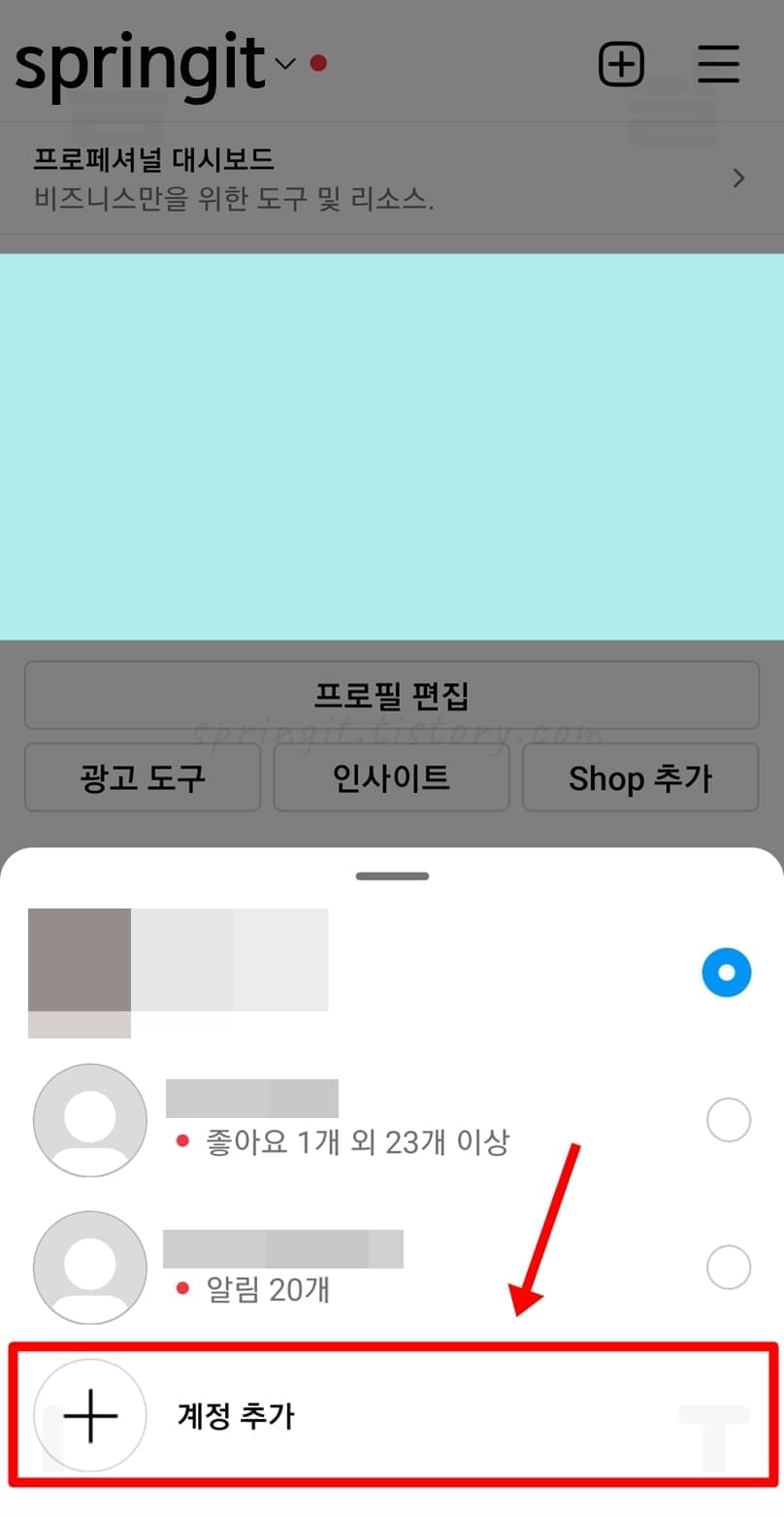 이곳에서 바로 인스타그램 부계정 목록이 보여지고 클릭할 때마다 선택한 계정으로 전환해서 쉽게 사용할 수 있습니다. 여기서 보여지는 목록의 부계정들을 삭제해보도록 하겠습니다.