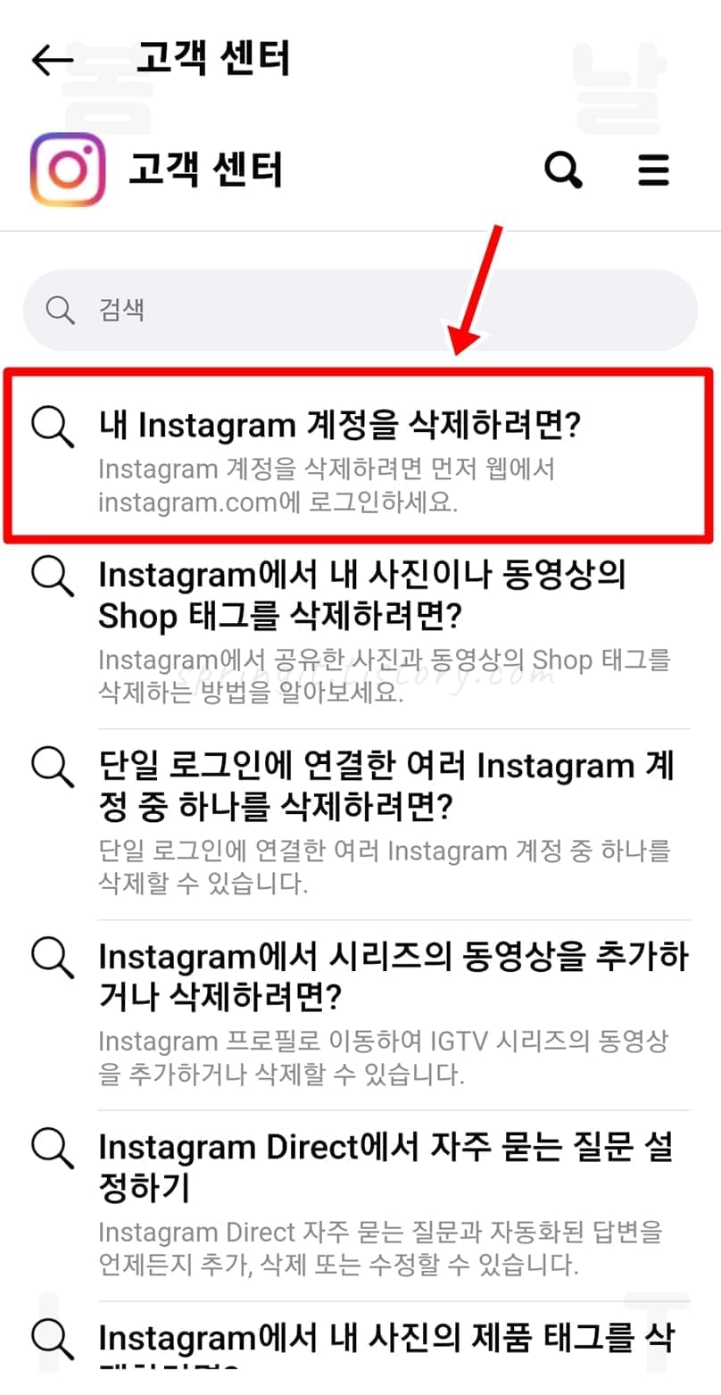 7. 검색결과에서 내 Instagram 계정을 삭제하려면?을 클릭합니다.