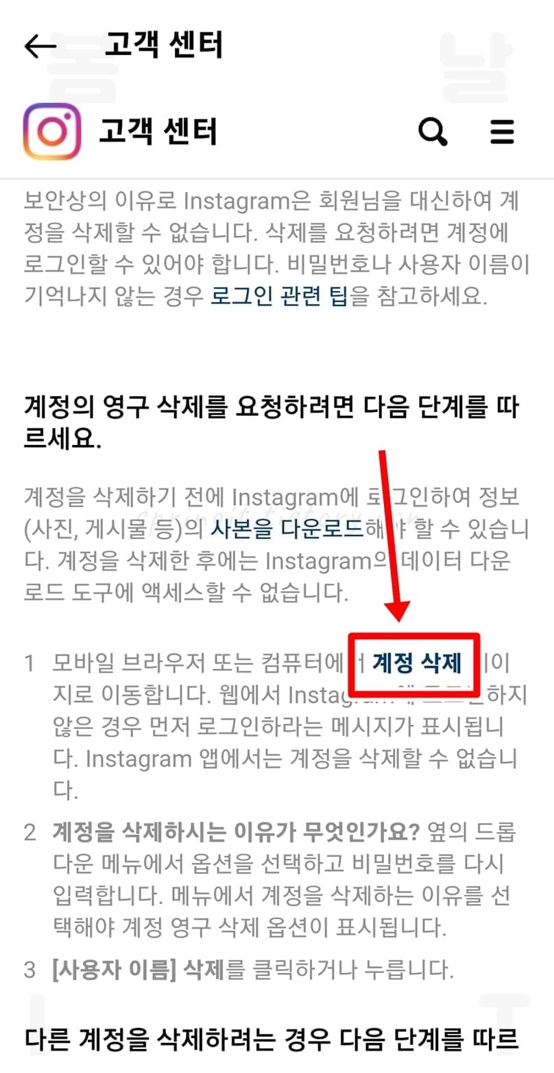 8. 글 안에서 계정 삭제를 찾아서 누릅니다.