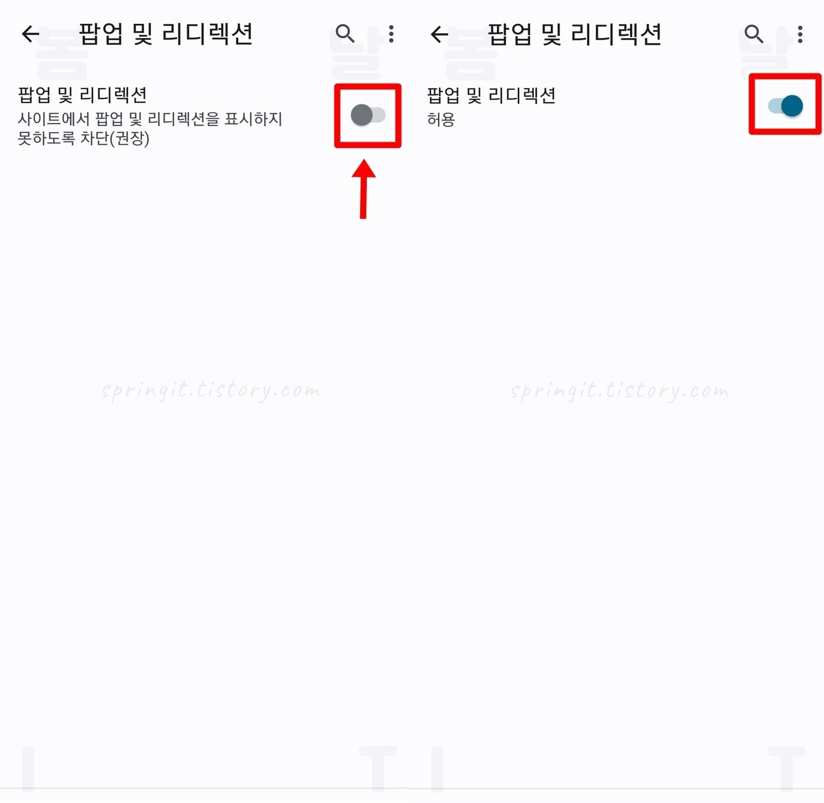 6. 토글바를 활성화시 팝업 허용, 비활성화시 팝업 차단됩니다.